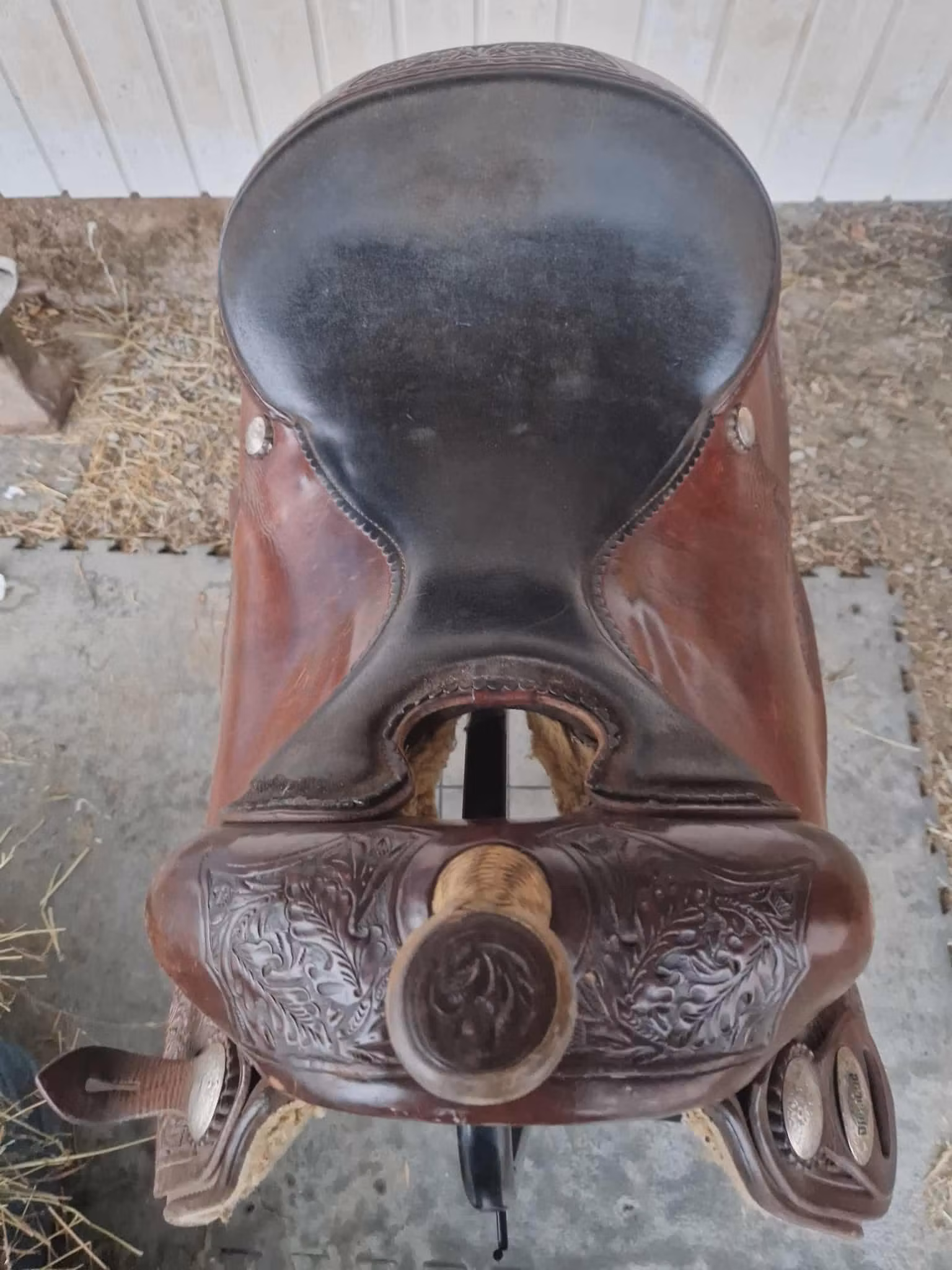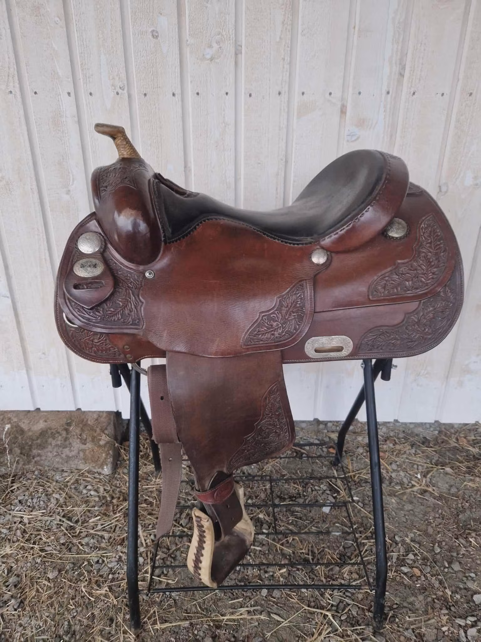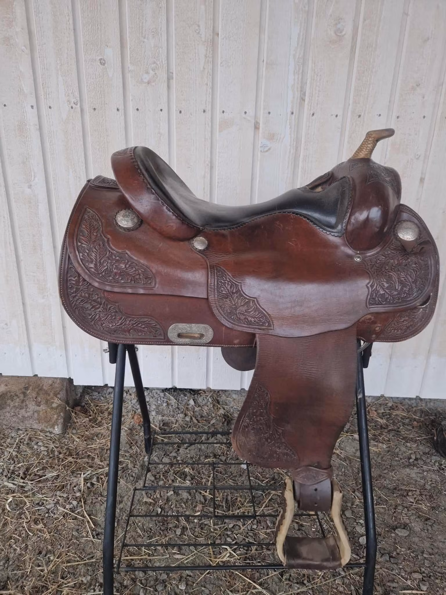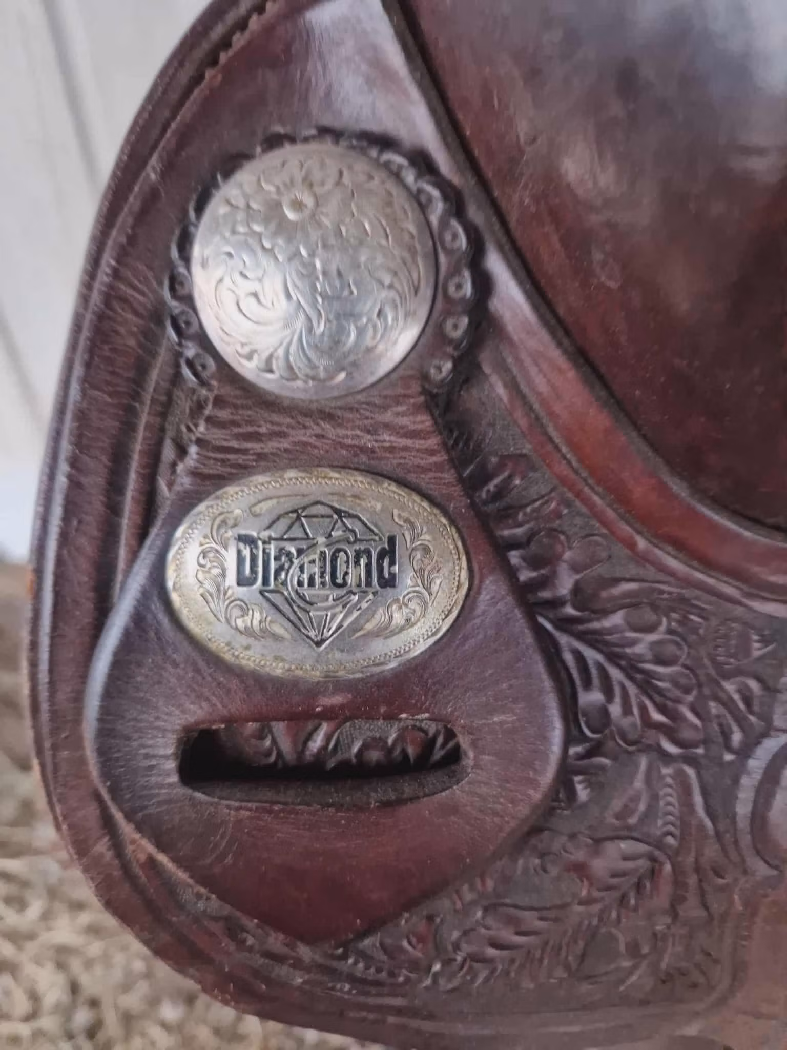 En begagnad och välanvänt snygg och unik Diamond C reining allroundsadel med fin tooling. Sadel har en FQ bom och en mjuk 16 tum mockasits.