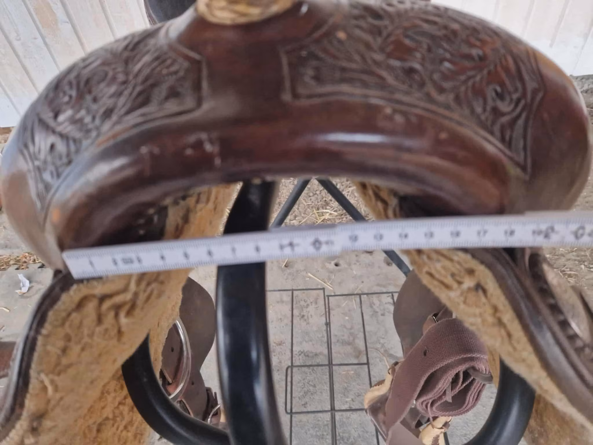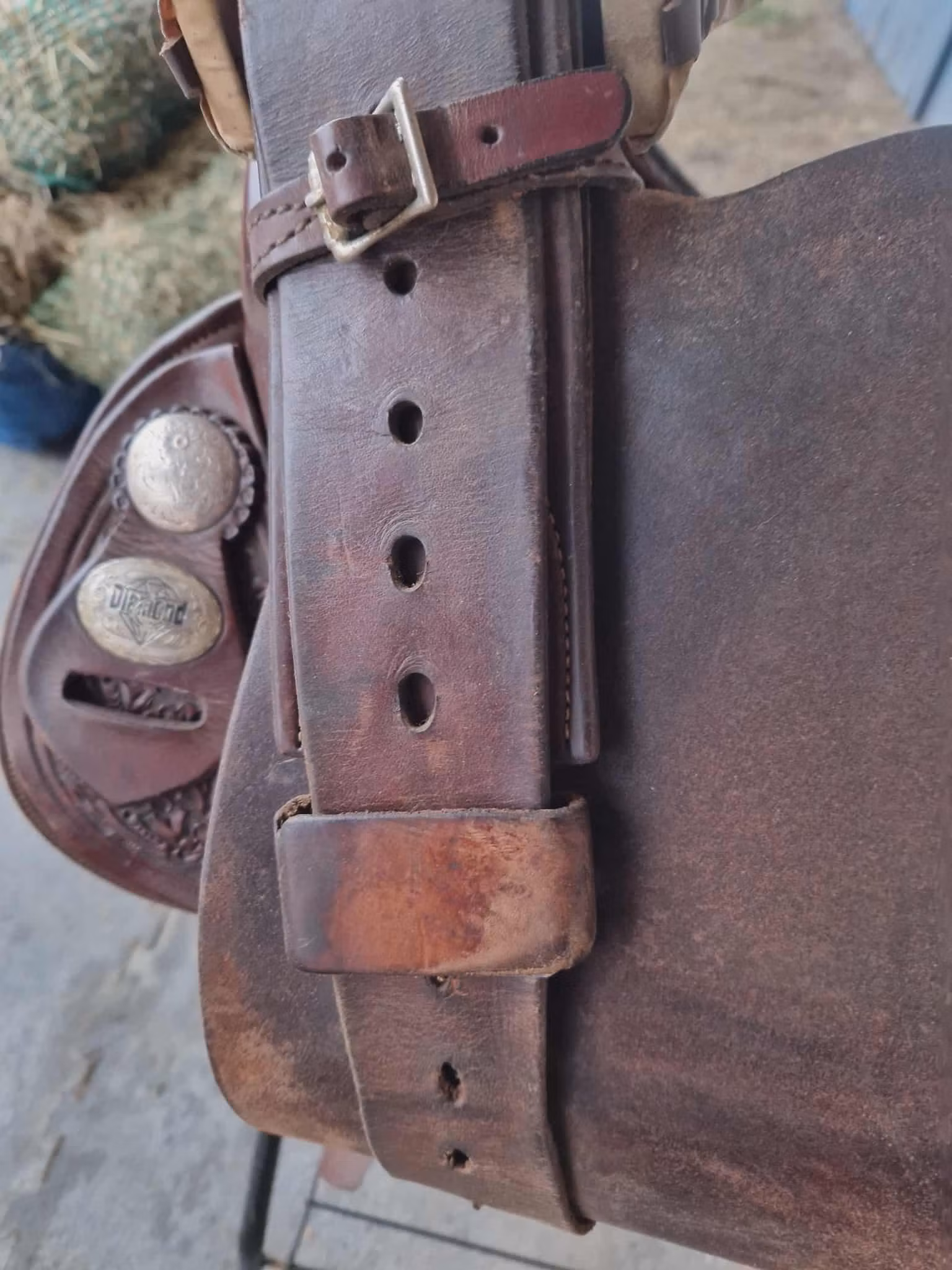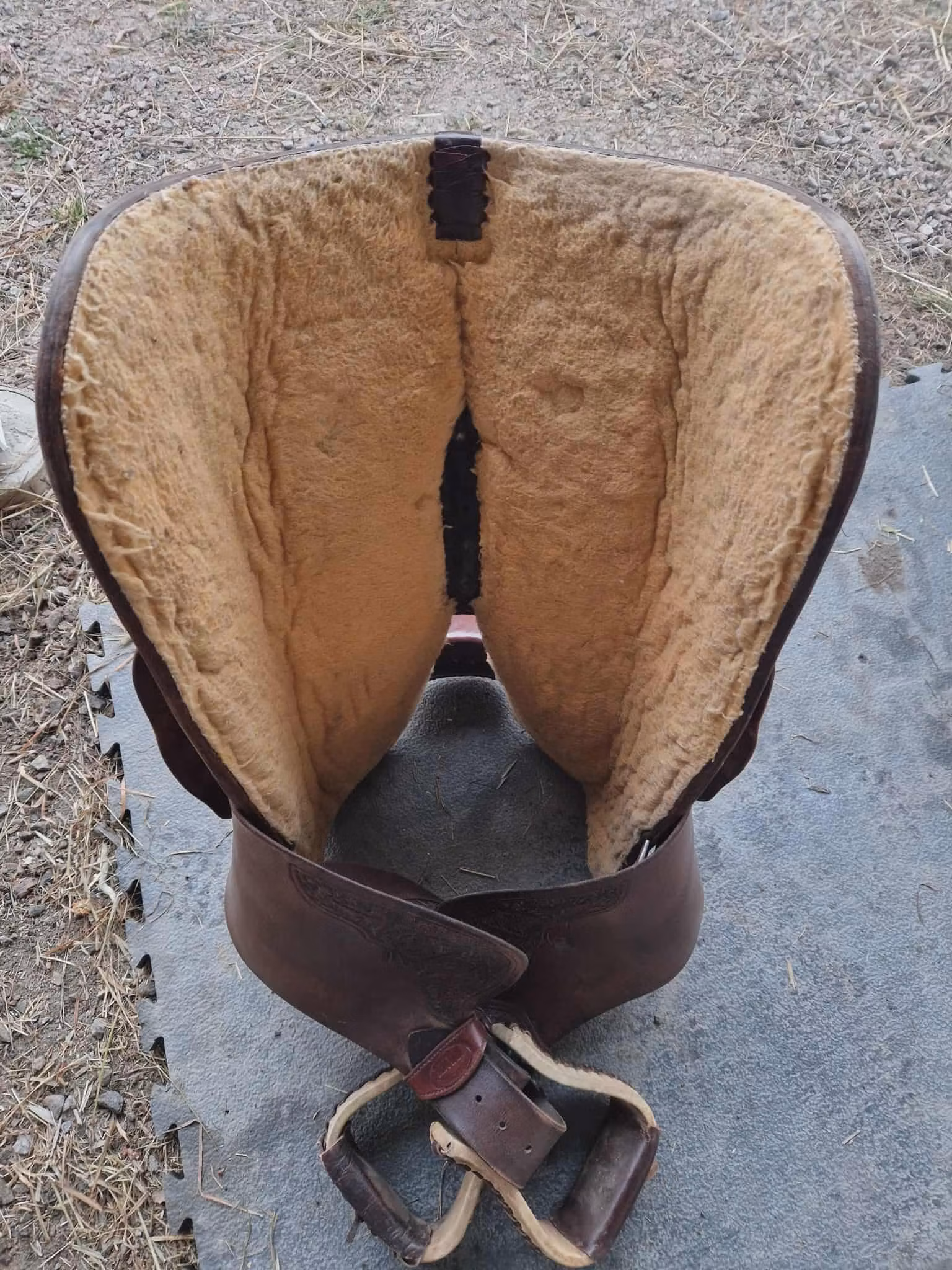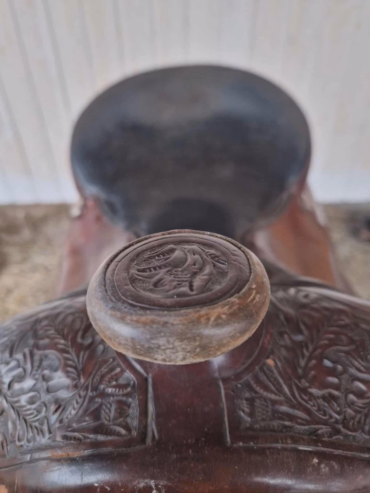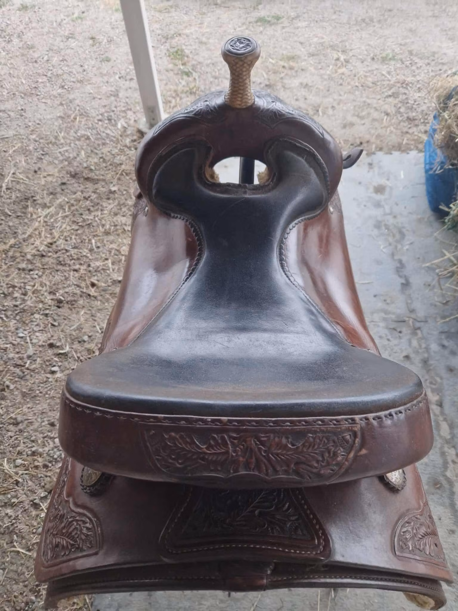 En begagnad och välanvänt snygg och unik Diamond C reining allroundsadel med fin tooling. Sadel har en FQ bom och en mjuk 16 tum mockasits.