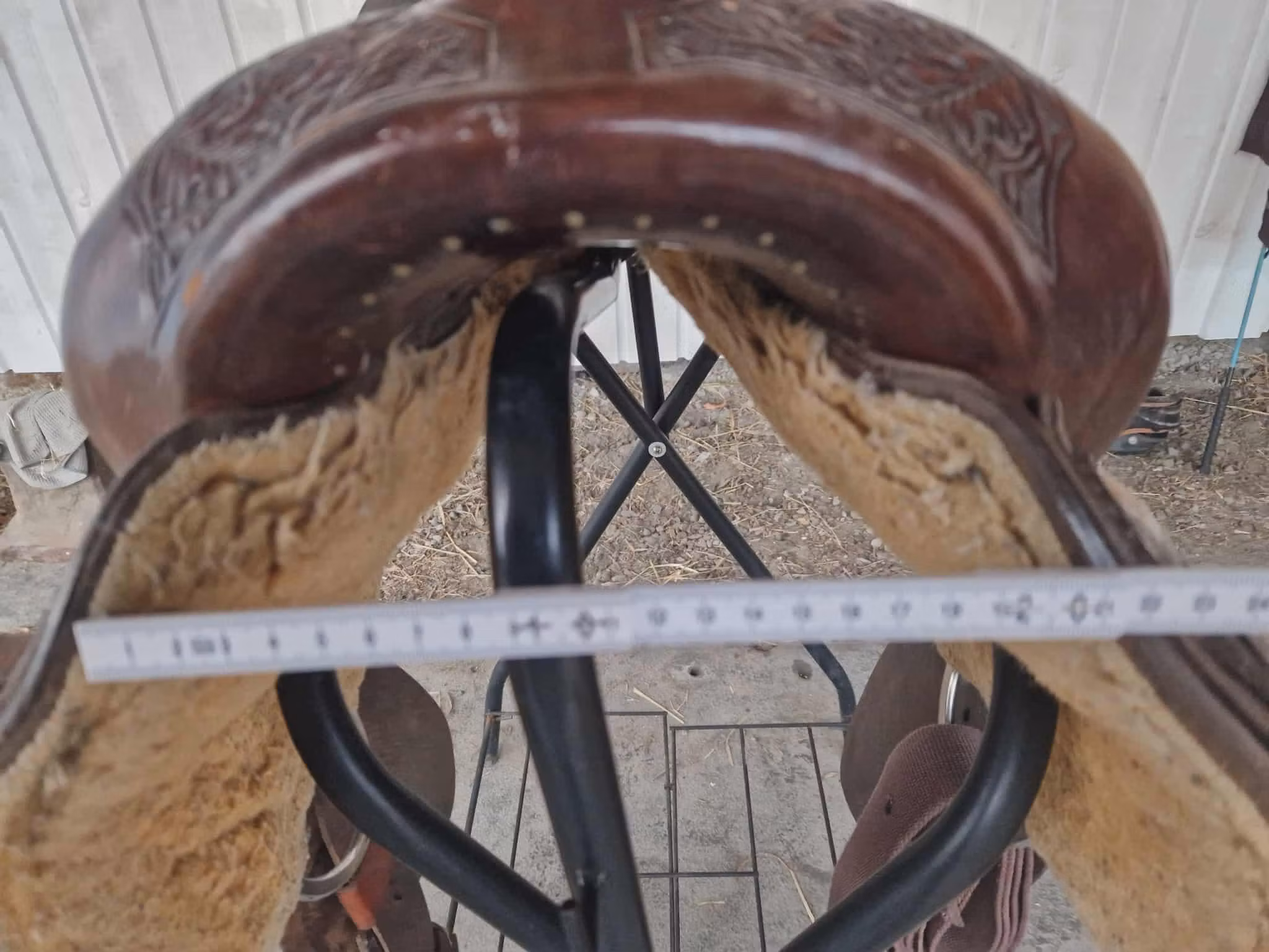 Sadeln är i bra skick men har bruskspår som inte påverkar användningen. Jättebekväm att sitta i, en riktig bra allroundsadel för den medium bredda typ av häst med normal manke och ganska rak rygg.