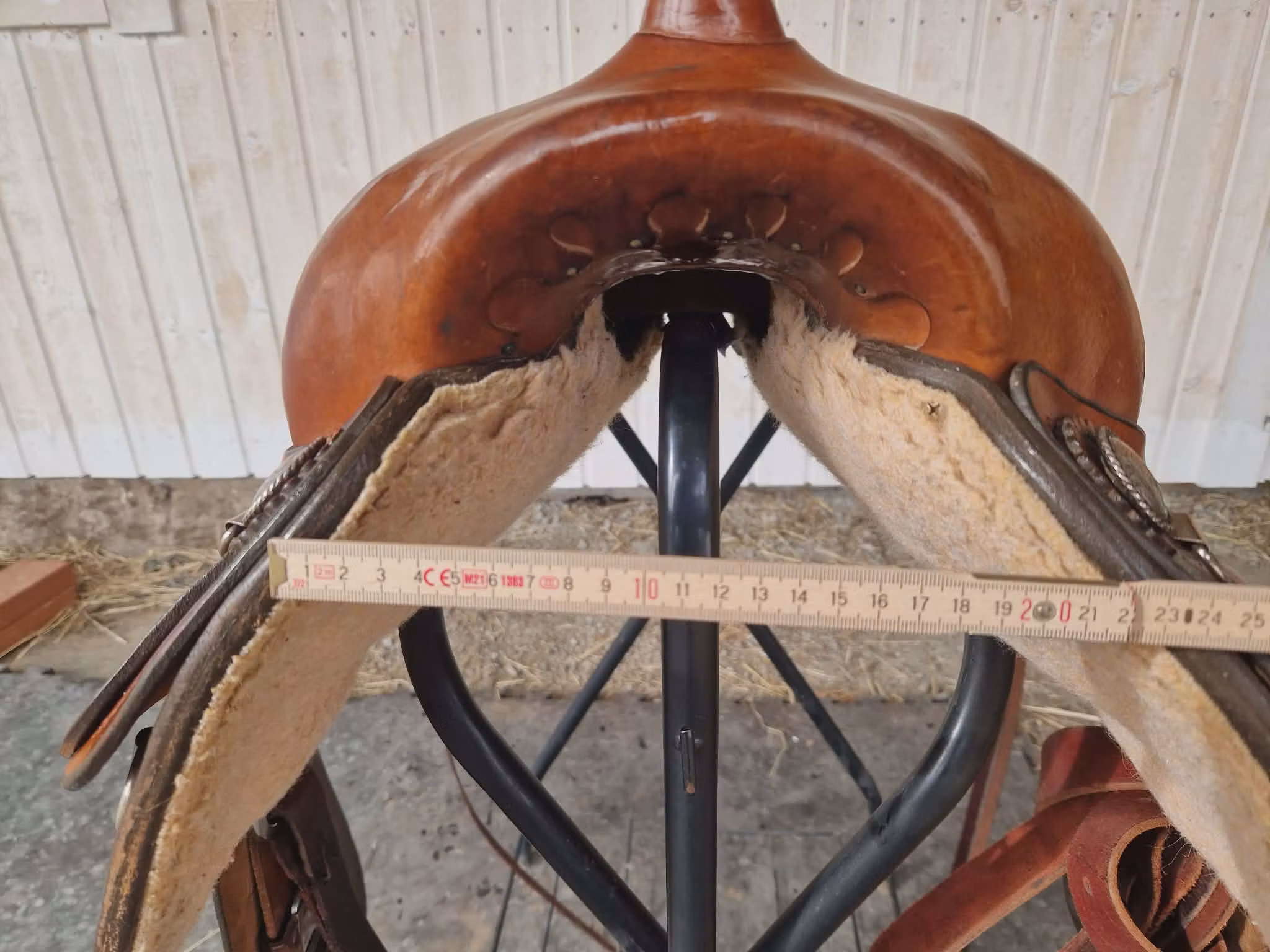 Begagnad Montana allround westernsadel i bra skick med bredd FQ bom som öppnar bra över bogarna och 16 tum sits.