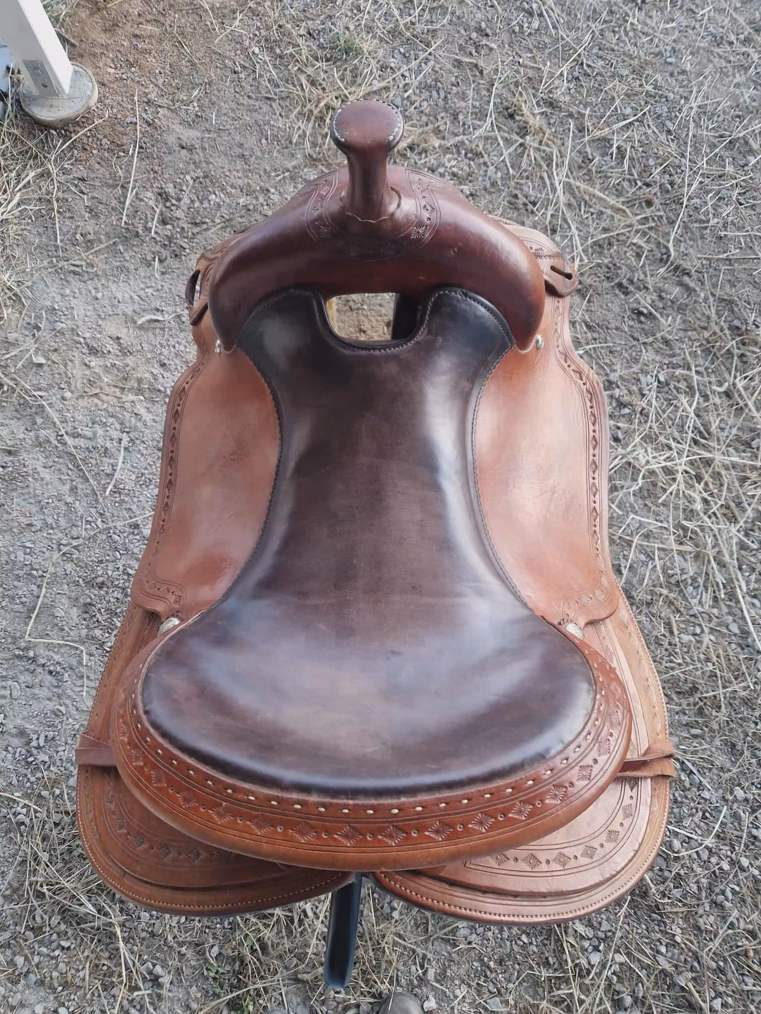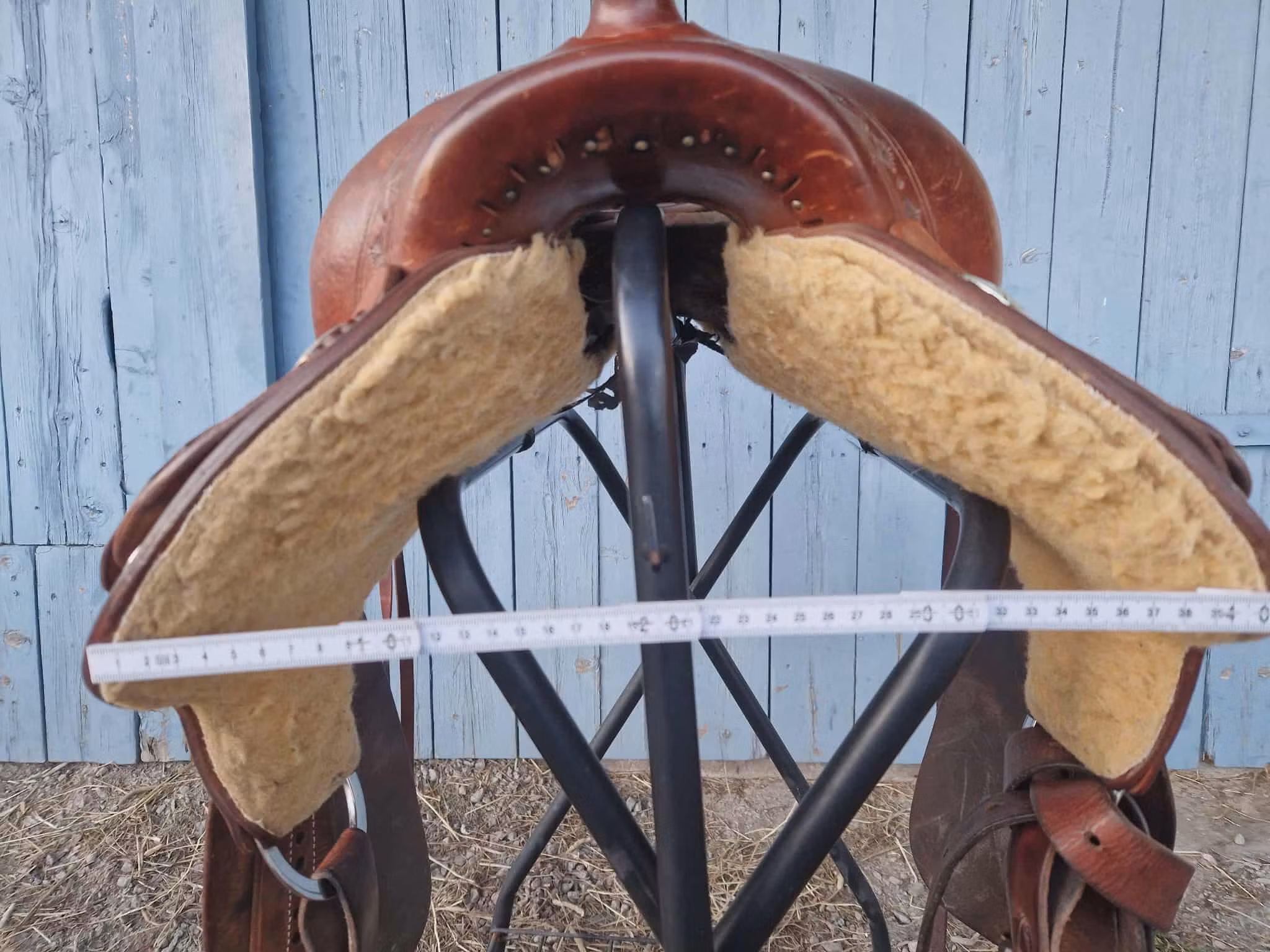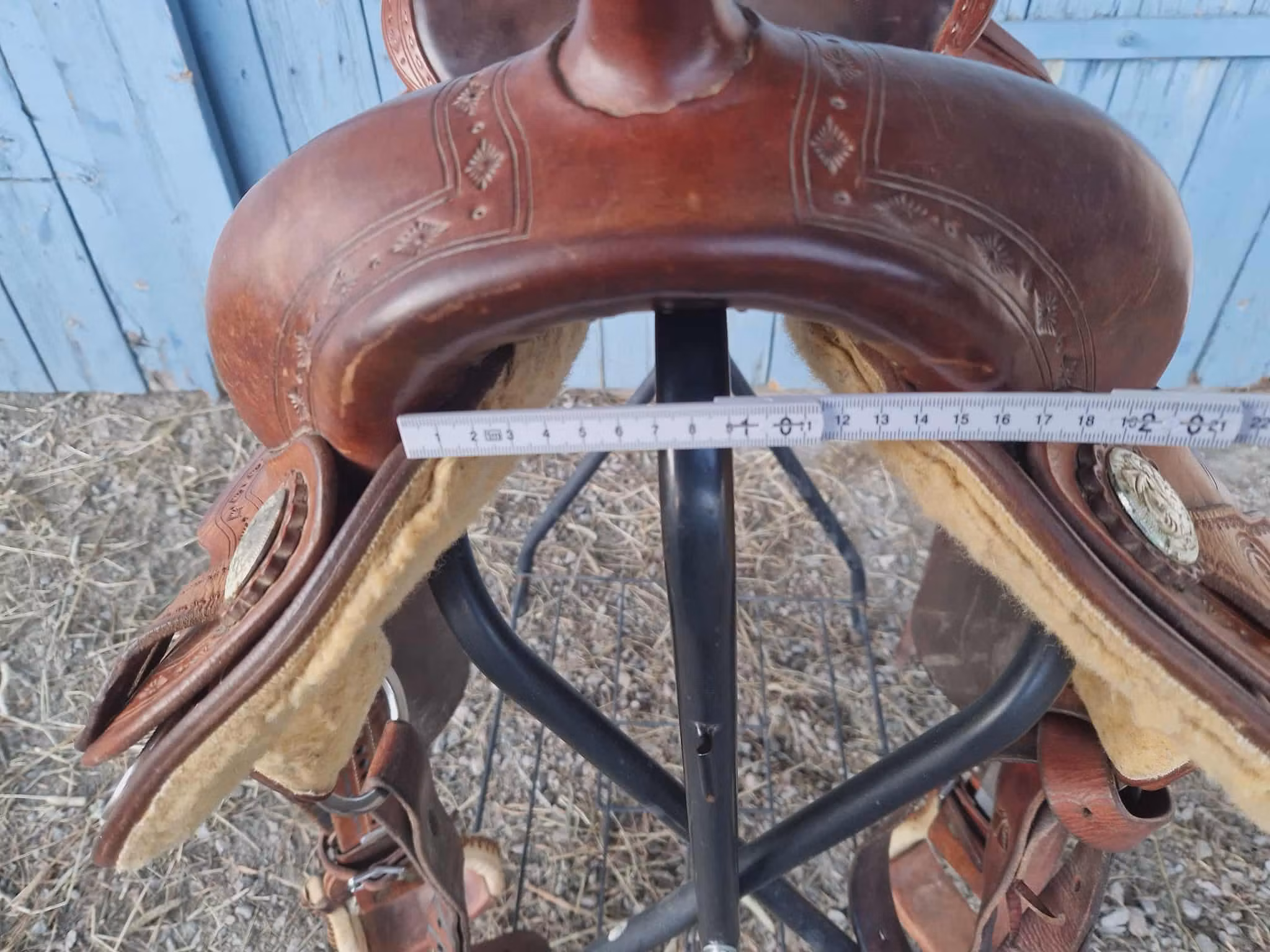 Fin tripple w (www) westernsadel med dropdown rigging (som ger sadeln en bättre stablilität att ligga på plats även hästen är rund över ryggen) med en rymlig 16 tum mjuk paddad sits och bordertooling. Sadeln ligger bäst på den breddare typ häst med ganska rak rygg och normal manke, den öppnar fin över bogerna. Sadeln är 63 cm lång.