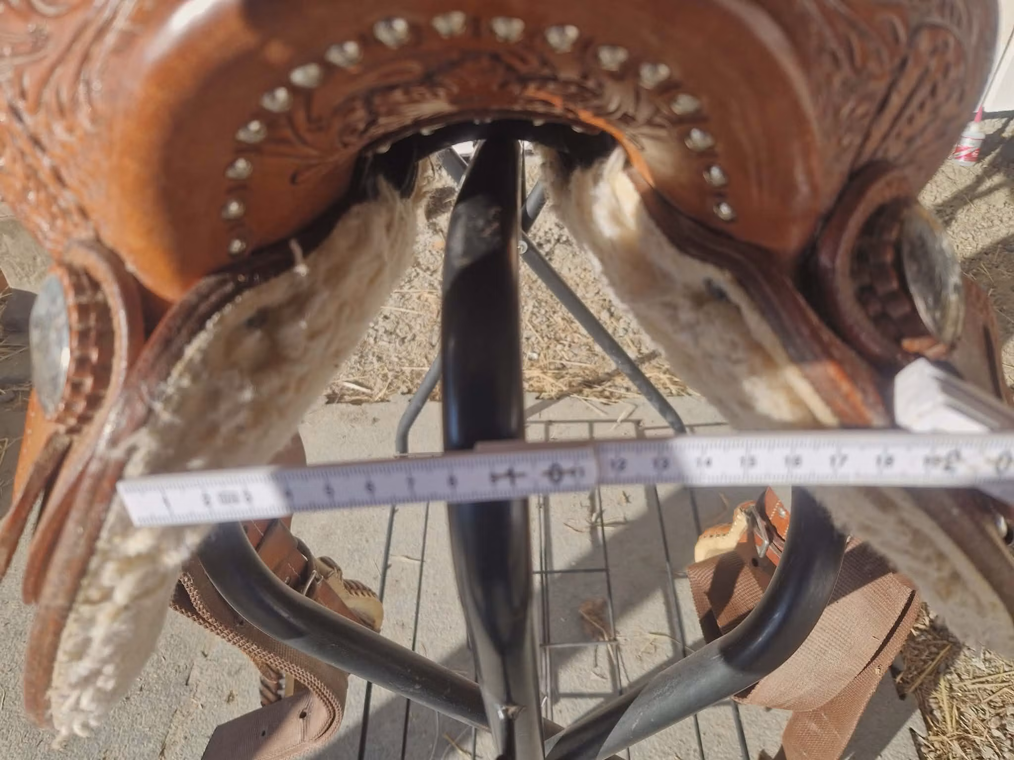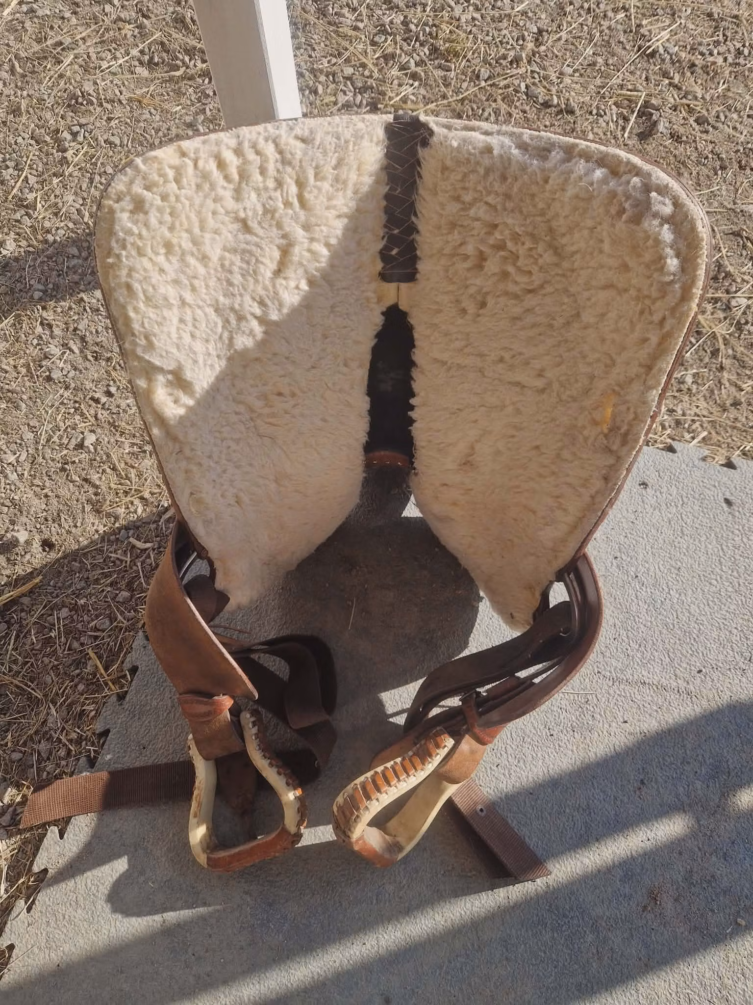 begagnad snygg westernsadel för barn "no name" men bra kvalität. Den har en 12 tum mjuk mockasits och ligger bra på den smalare tyå av hästar med ganska rak rygg, finns plats för manke. Funkar även på stora hästar som har manke och är smala med ganska rak rygg. Sadeln är 55 cm lång och väger inte ens 10 kg. Med ny nylon tiestrap och off-billet.