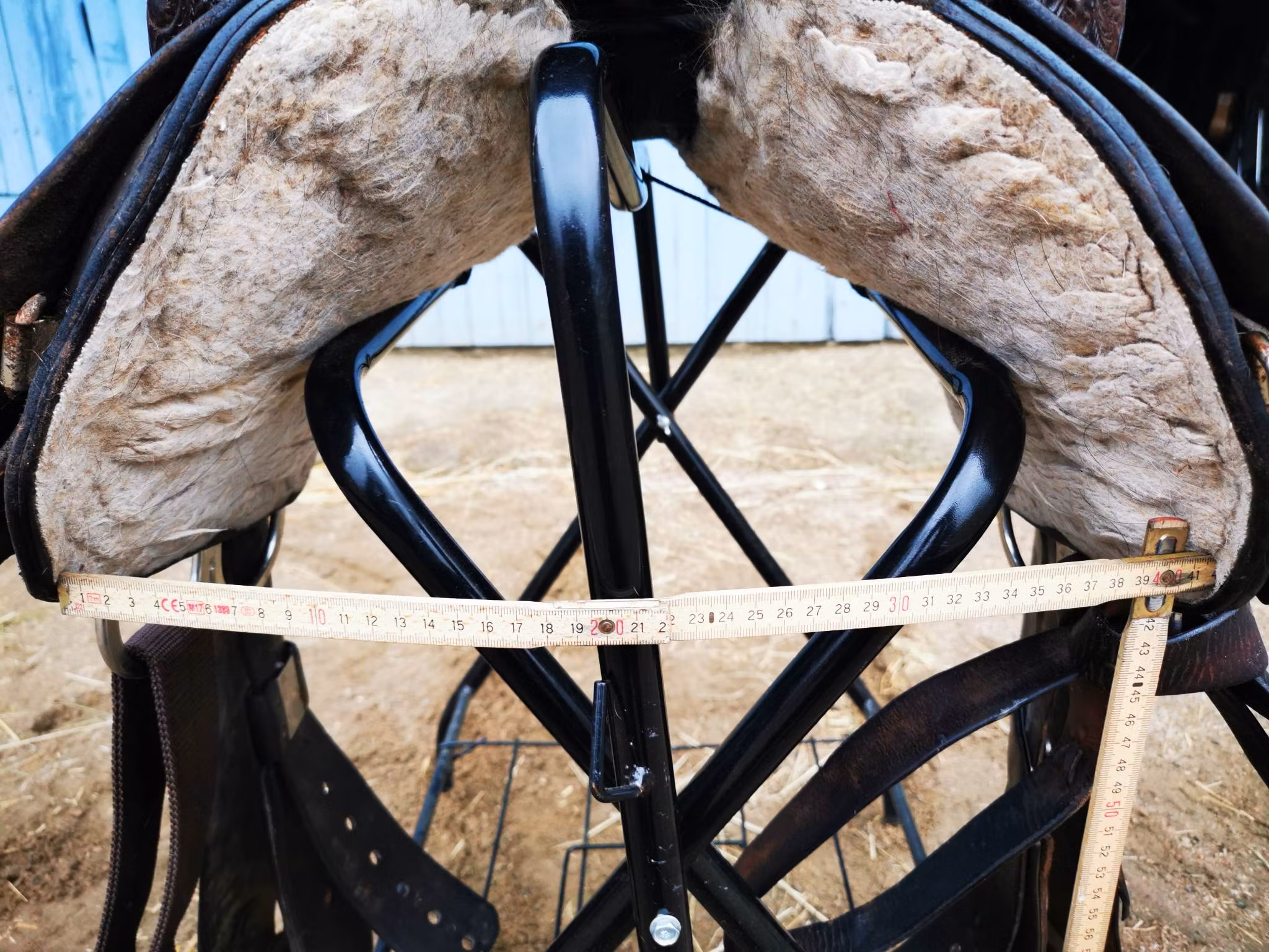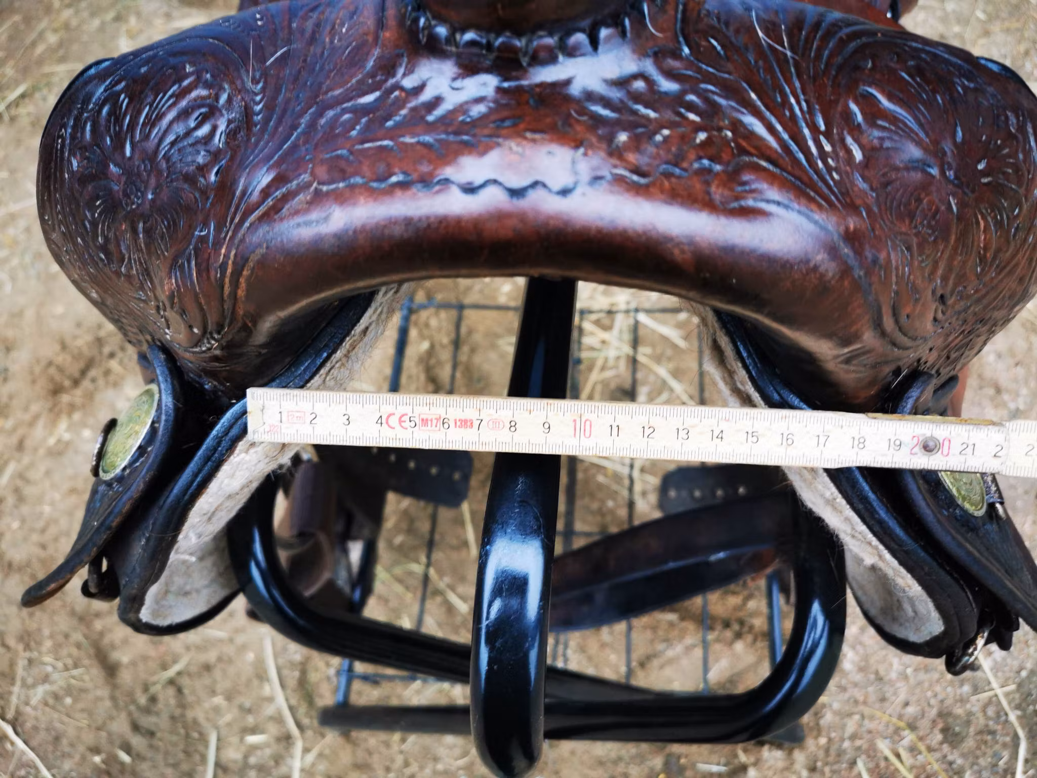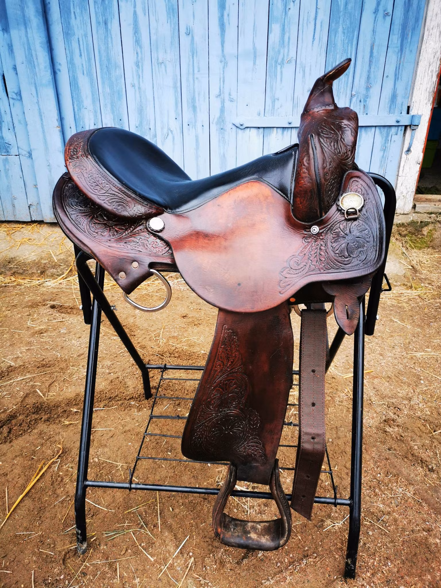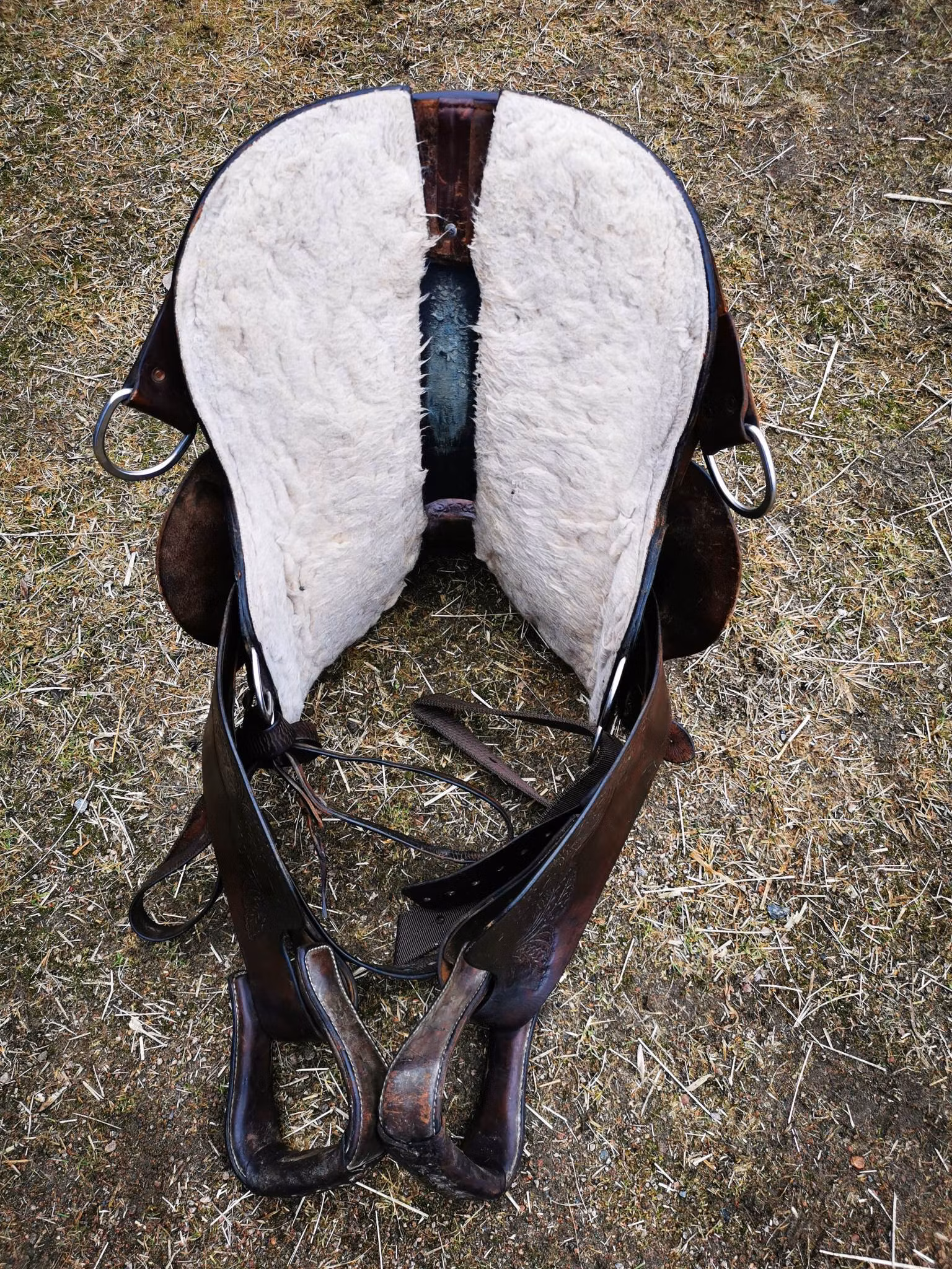 En äldre, snygg men välanvänd Circle Y park&ride FQ bom med 15 tum paddad sits med med möjlighet för V-system vid sadling för mer stabilität, så att sadeln ligger mer stadig (fördel om du har en häst som har inte mycket manke och är lite rundare.