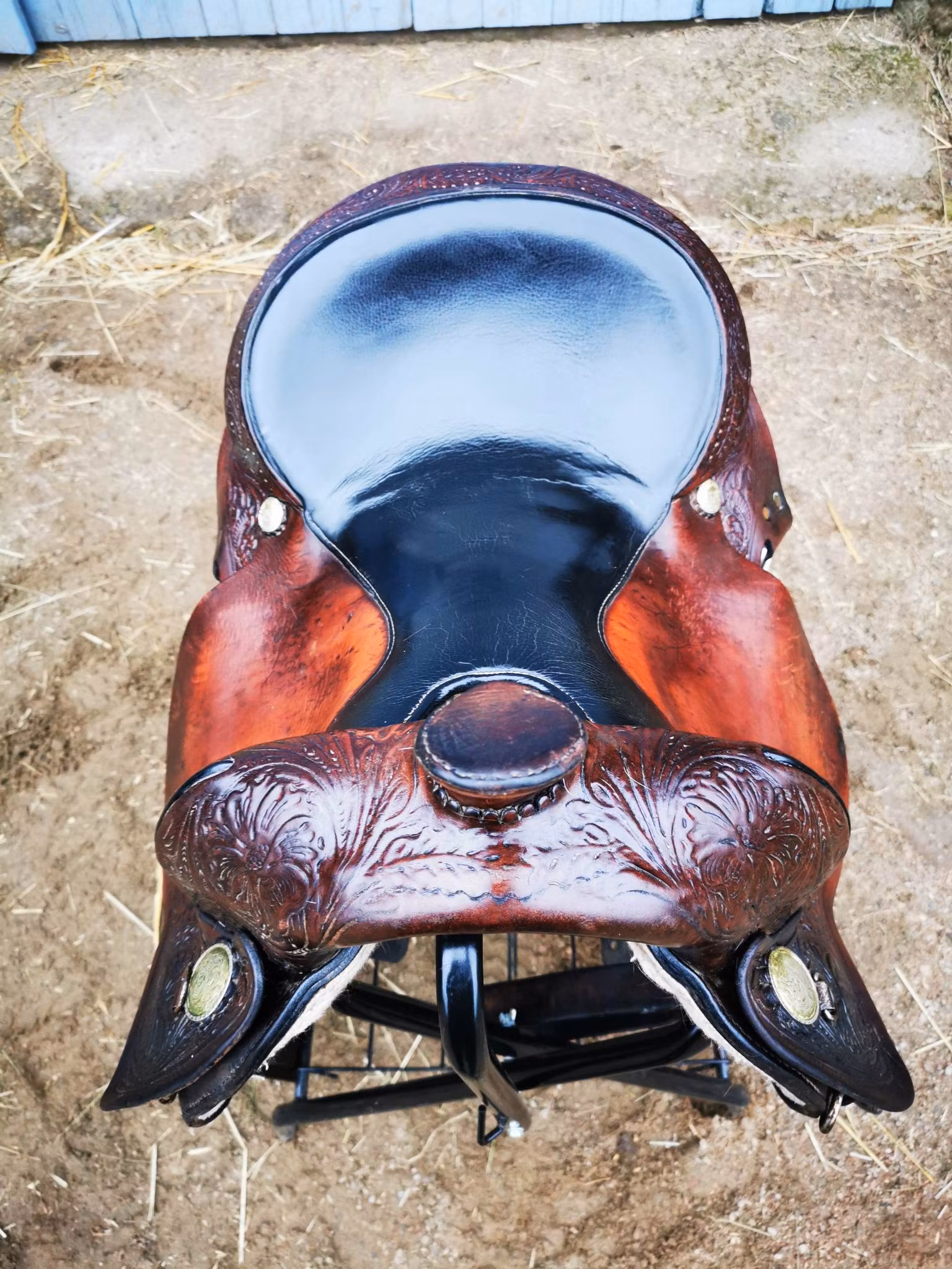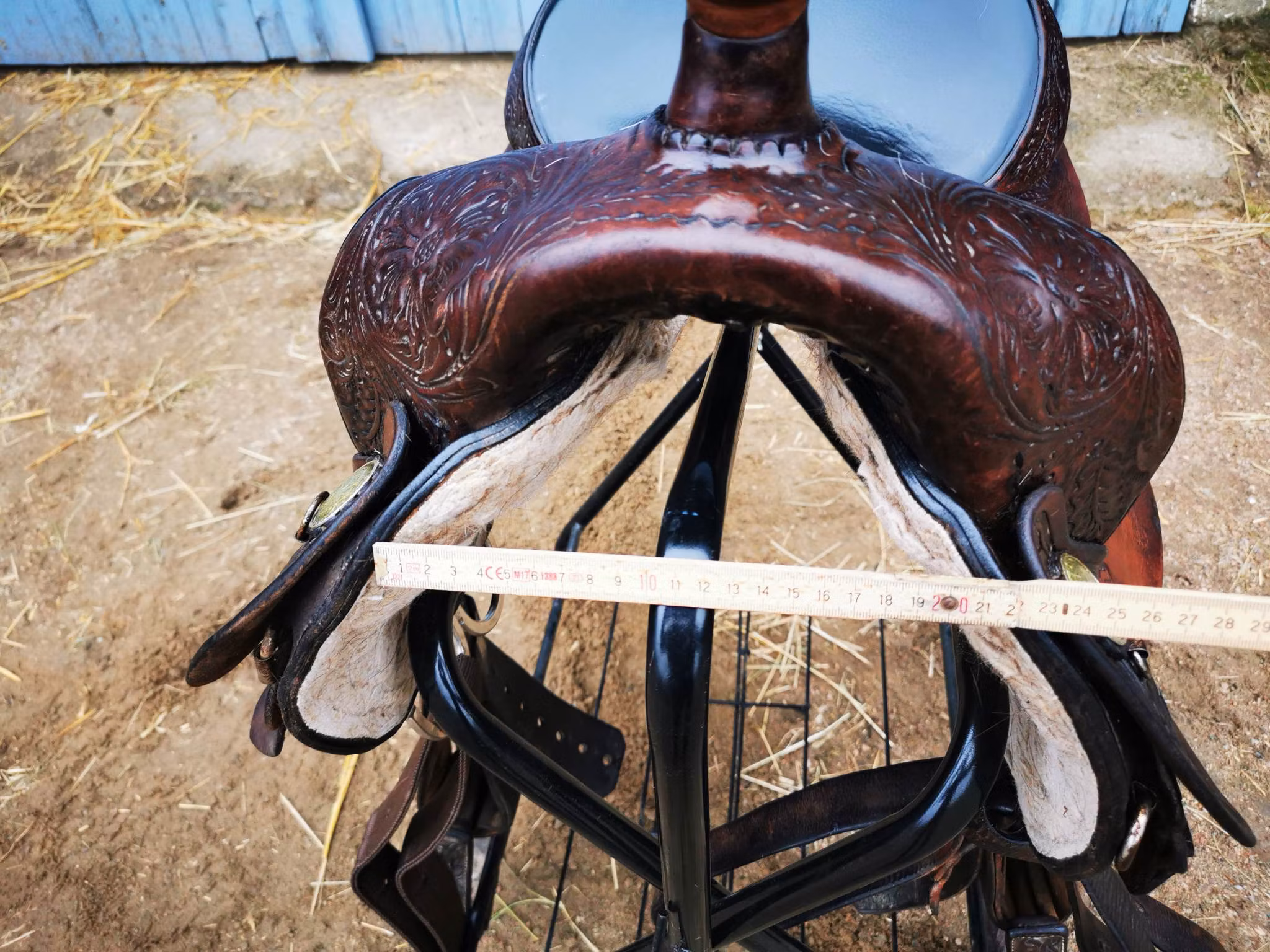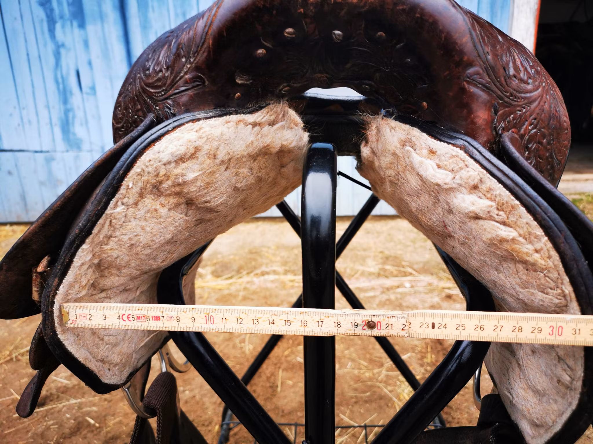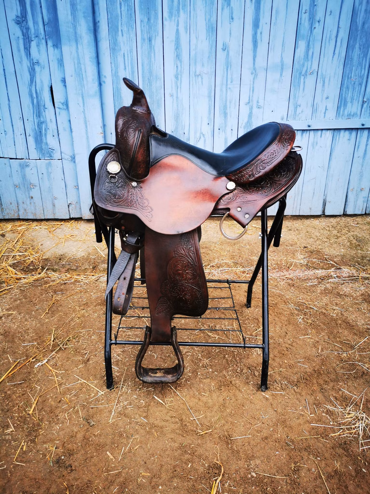 En äldre, snygg men välanvänd Circle Y park&ride FQ bom med 15 tum paddad sits med med möjlighet för V-system vid sadling för mer stabilität, så att sadeln ligger mer stadig (fördel om du har en häst som har inte mycket manke och är lite rundare.