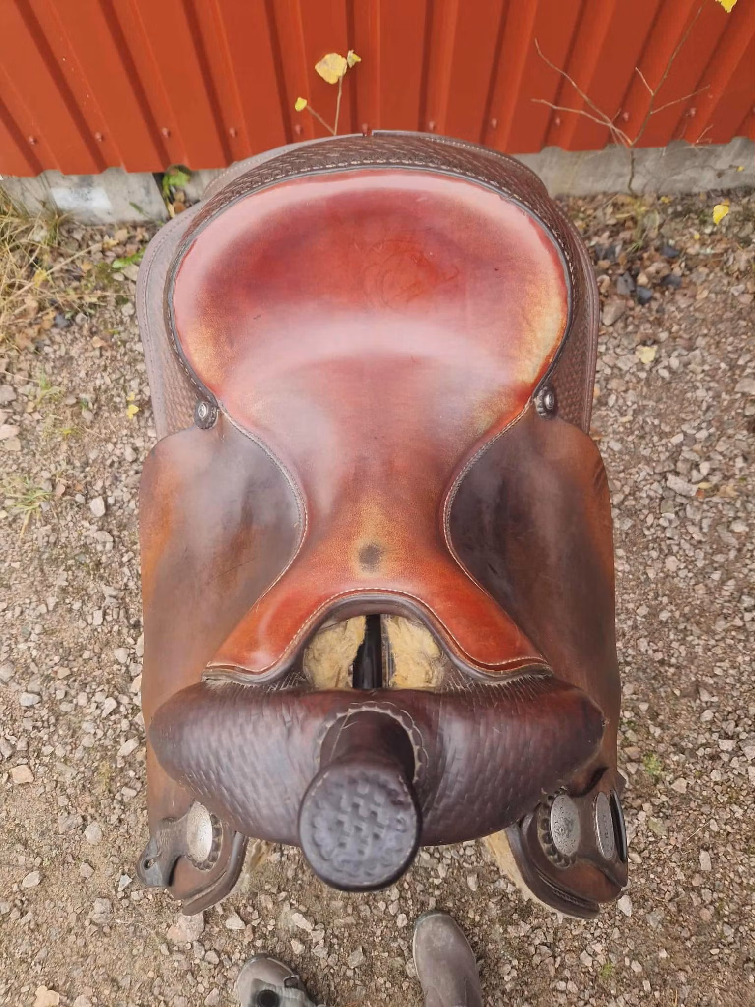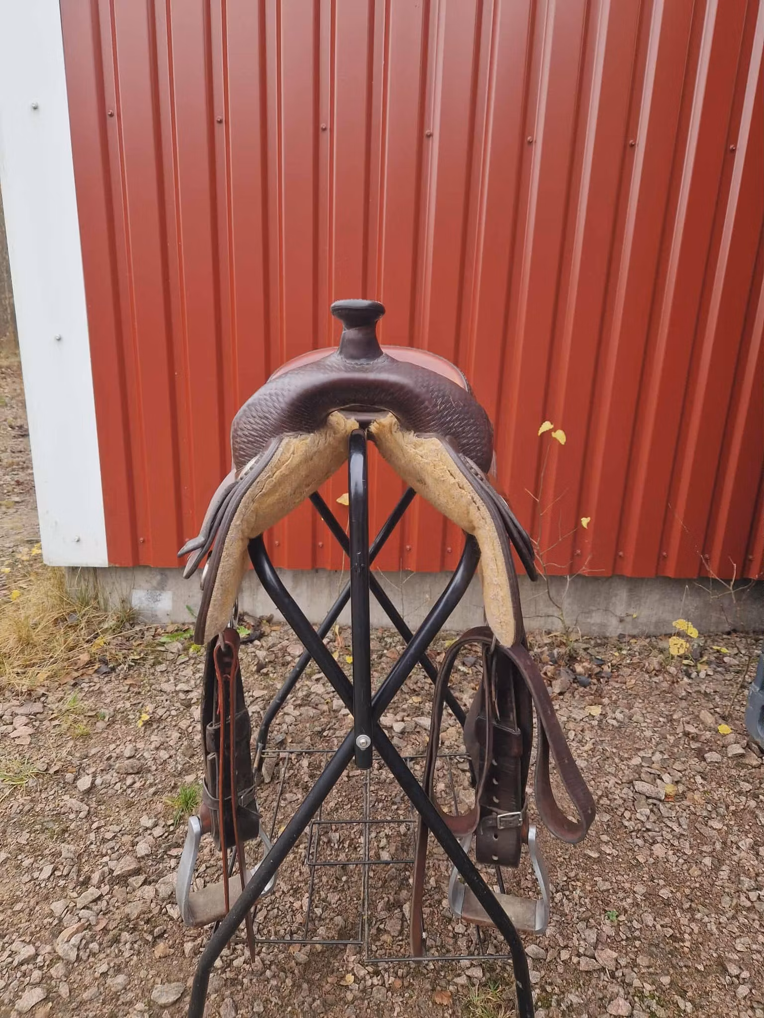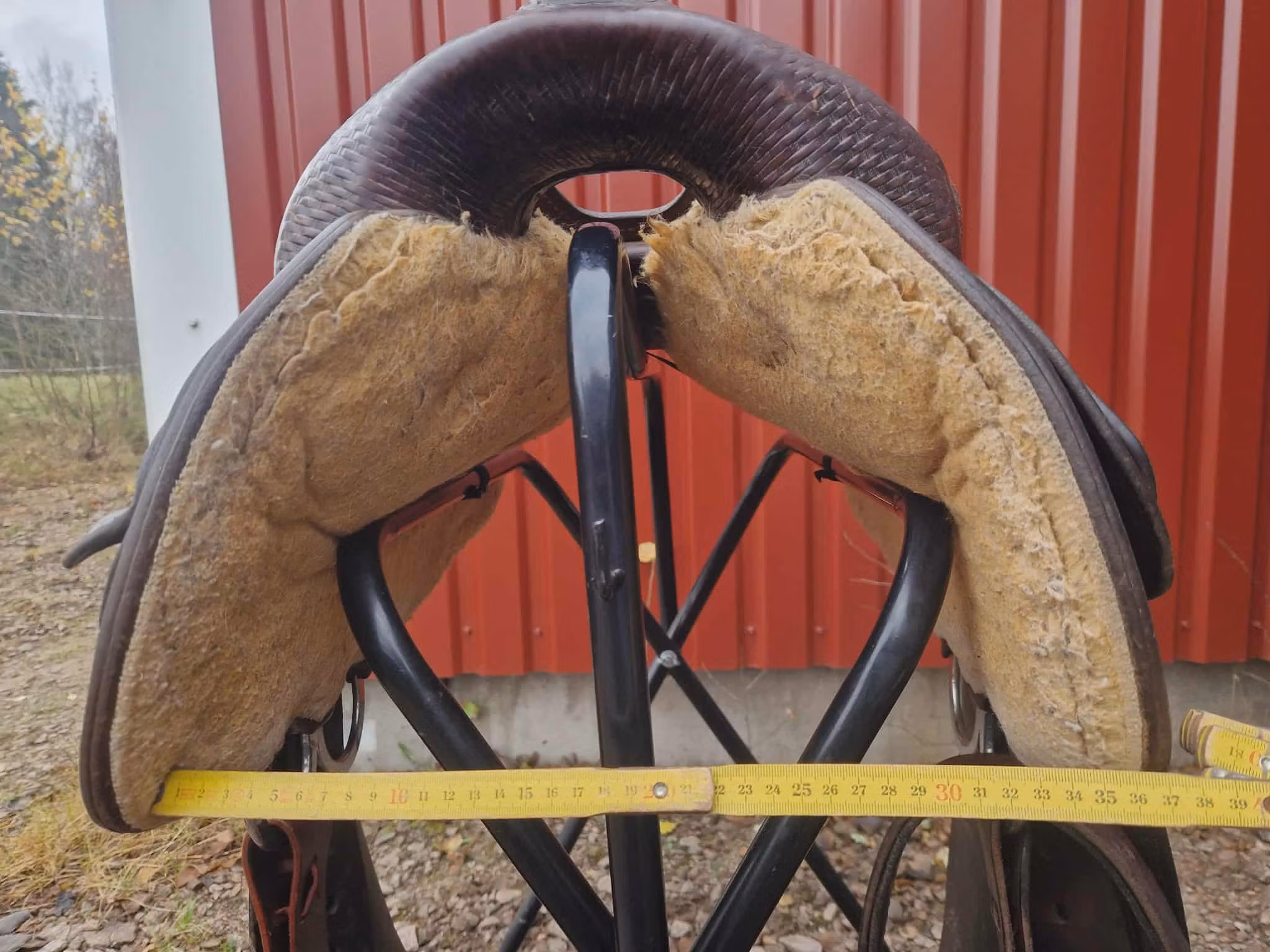 Sadeln är äldre och är mycket använt den har bruksspår, men inga som påverkar användningen och den är jättebekvämt att rida i.