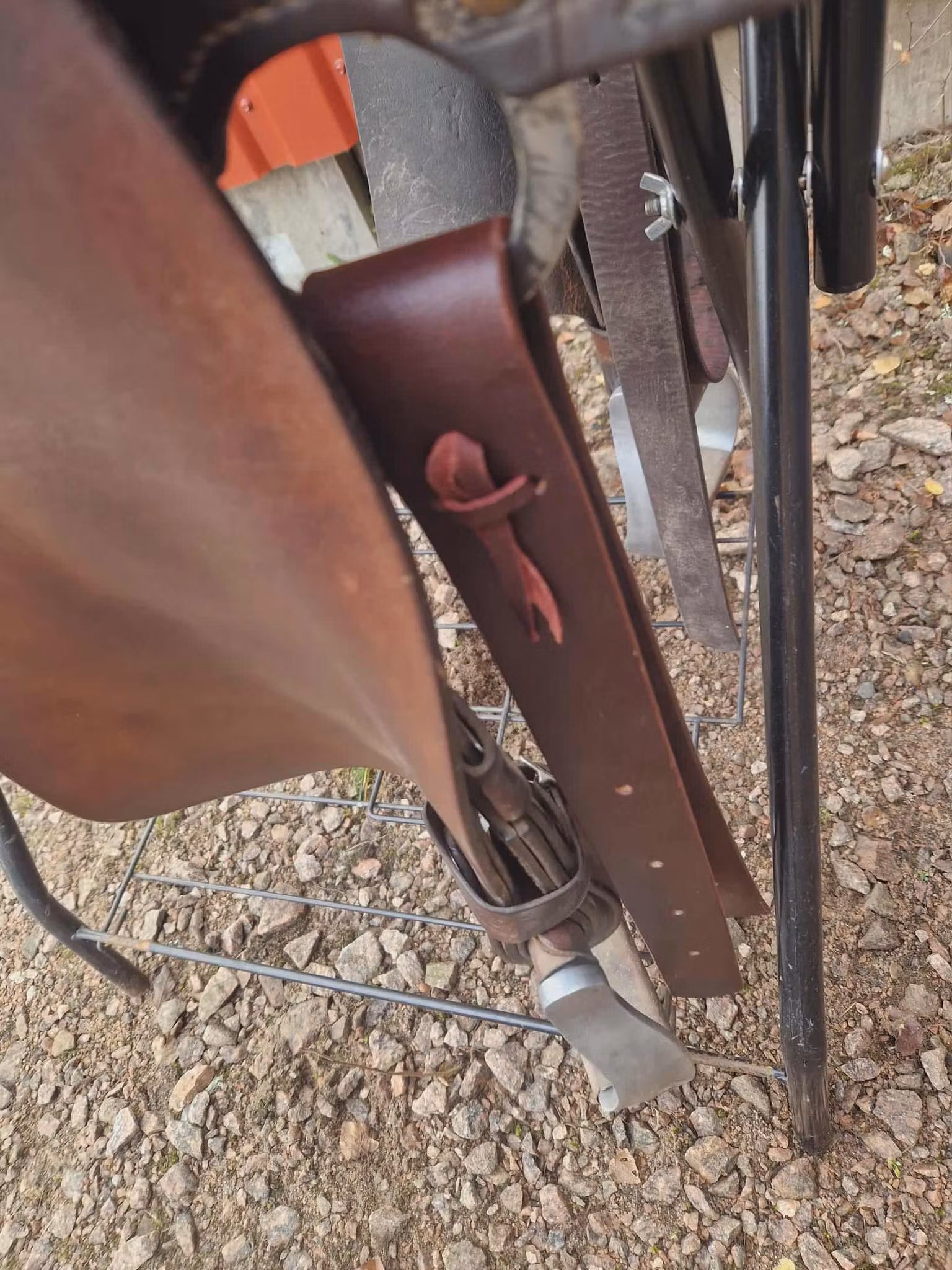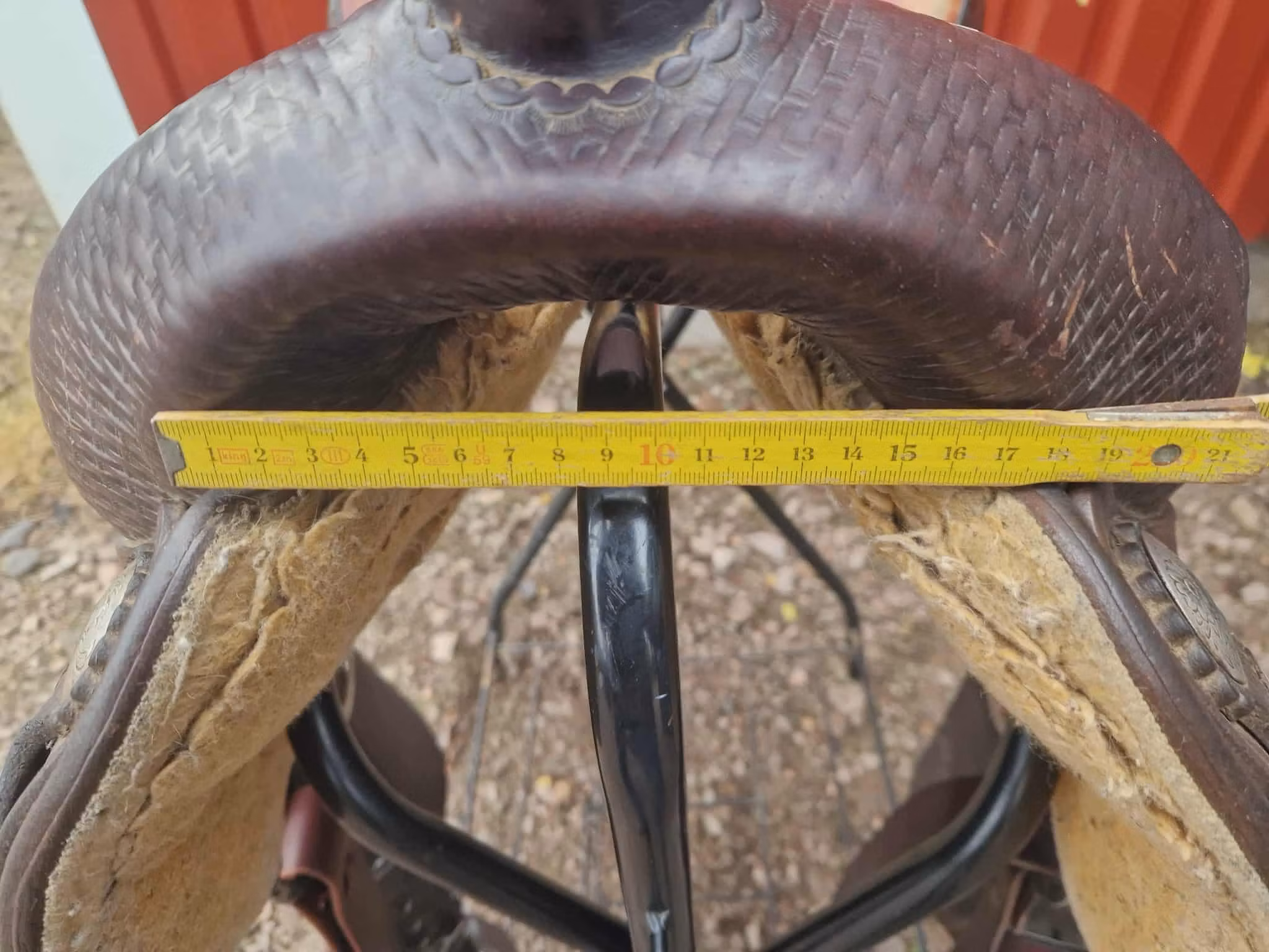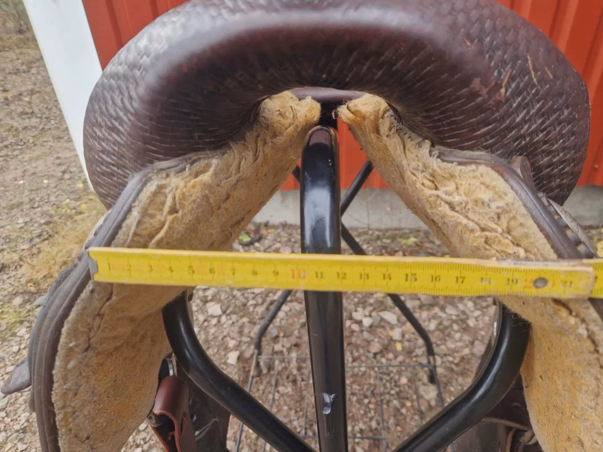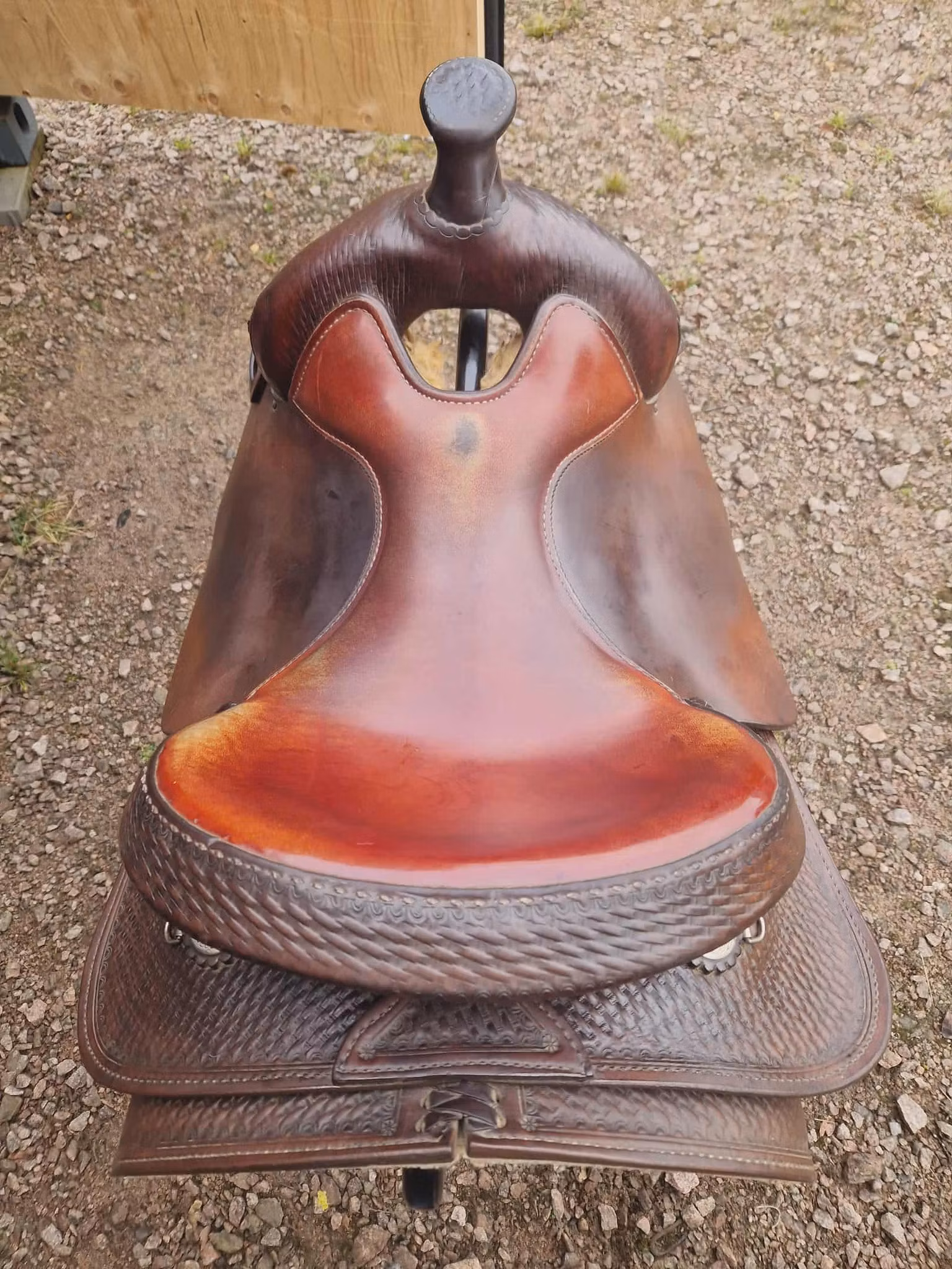 Sadeln är äldre och är mycket använt den har bruksspår, men inga som påverkar användningen och den är jättebekvämt att rida i.