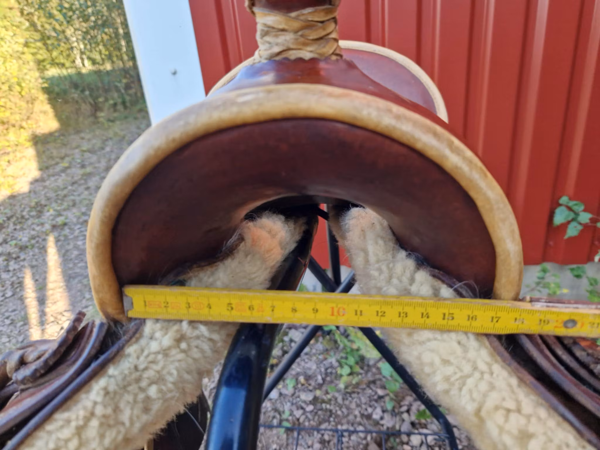 Snygg custom made oldtimer westernsadel , en unik Oldtime /Allround sadel med SQ bom som passar på många hästar som är smala, max. medium bredd , lite takformad i fram (eller hög manke) med ganska rak rygg (som fullblod, travare eller arab o.s.v). Sadel har en dypp bekväm hardsits som är 15 tum i storlek.