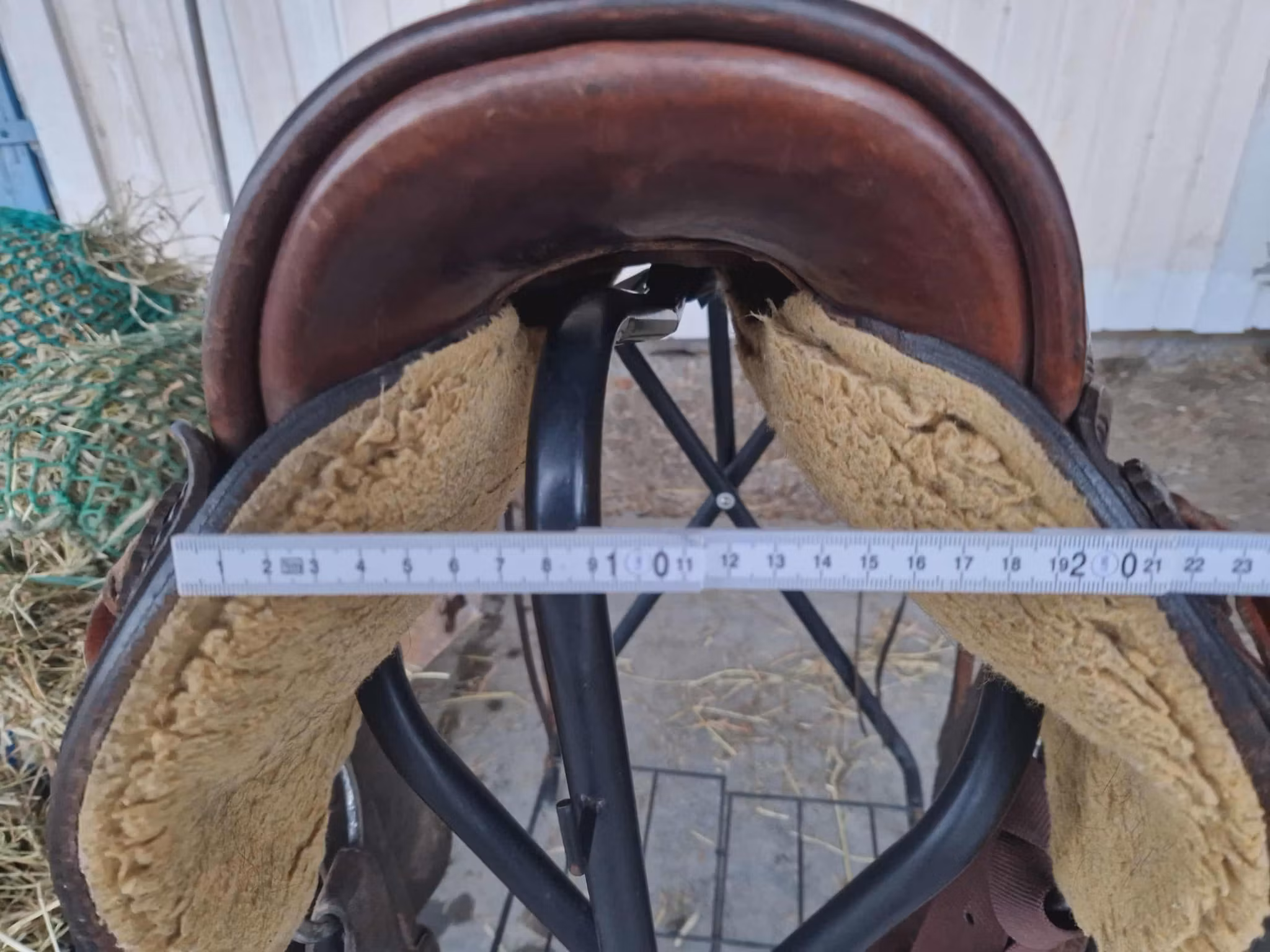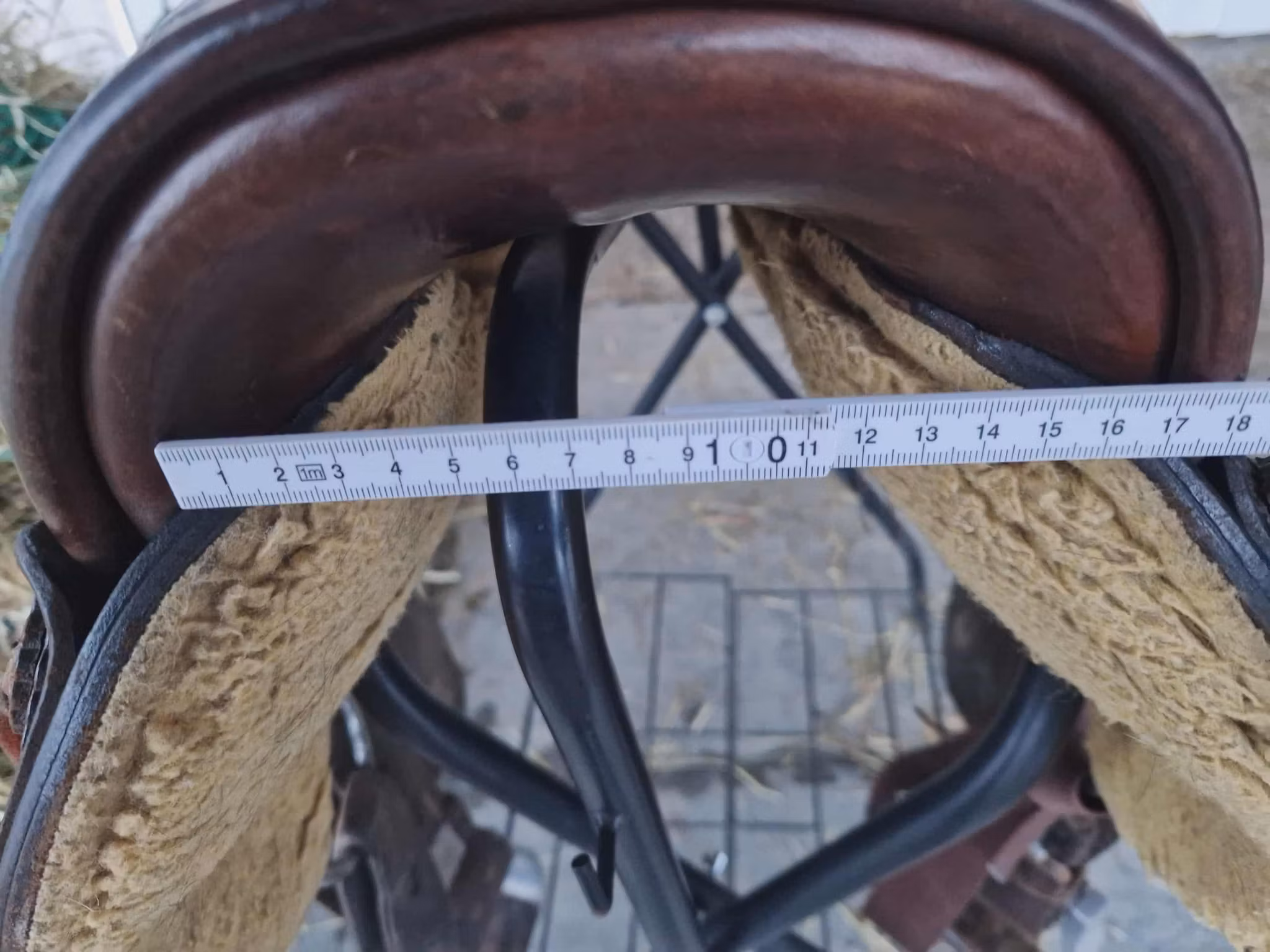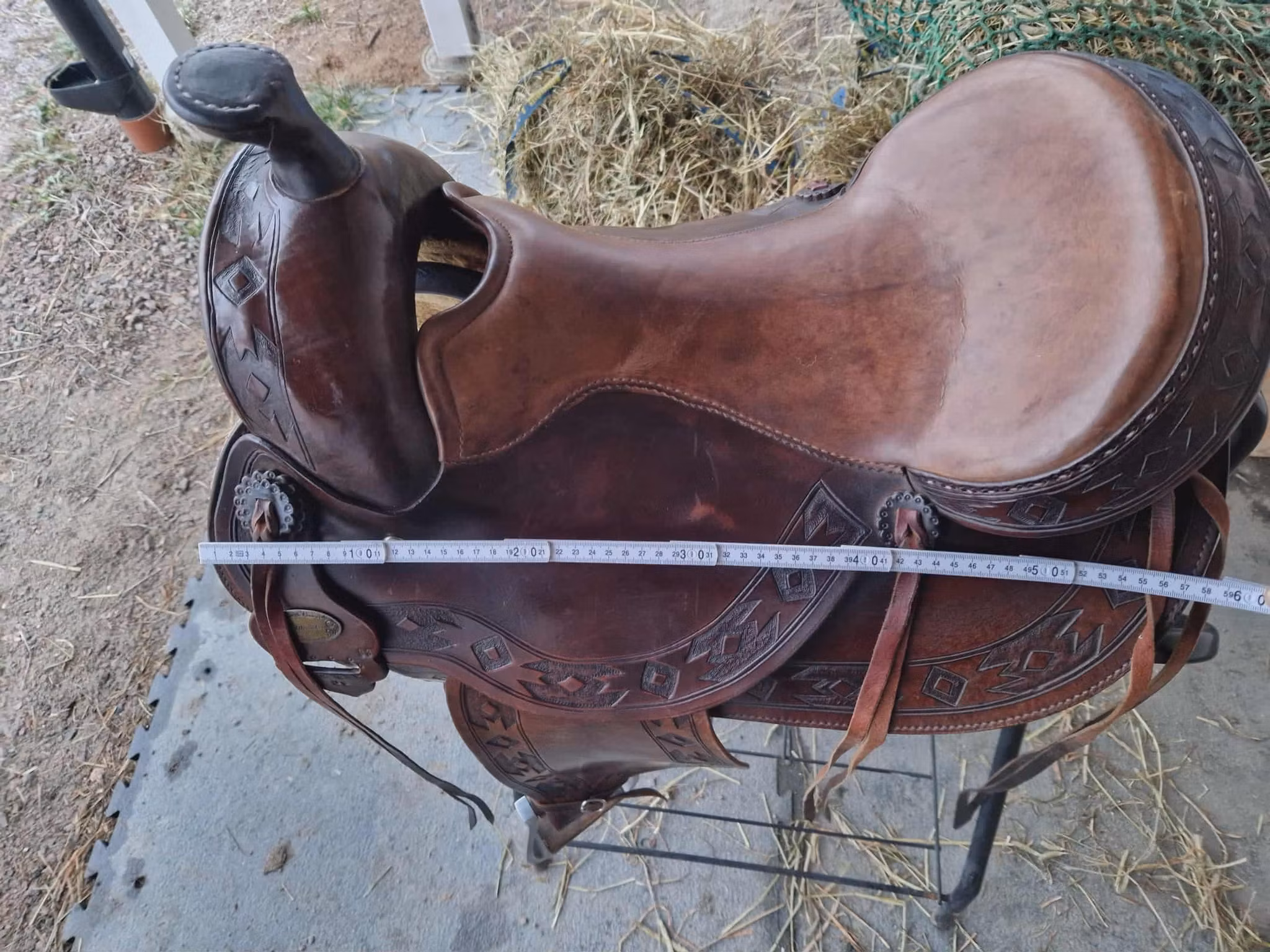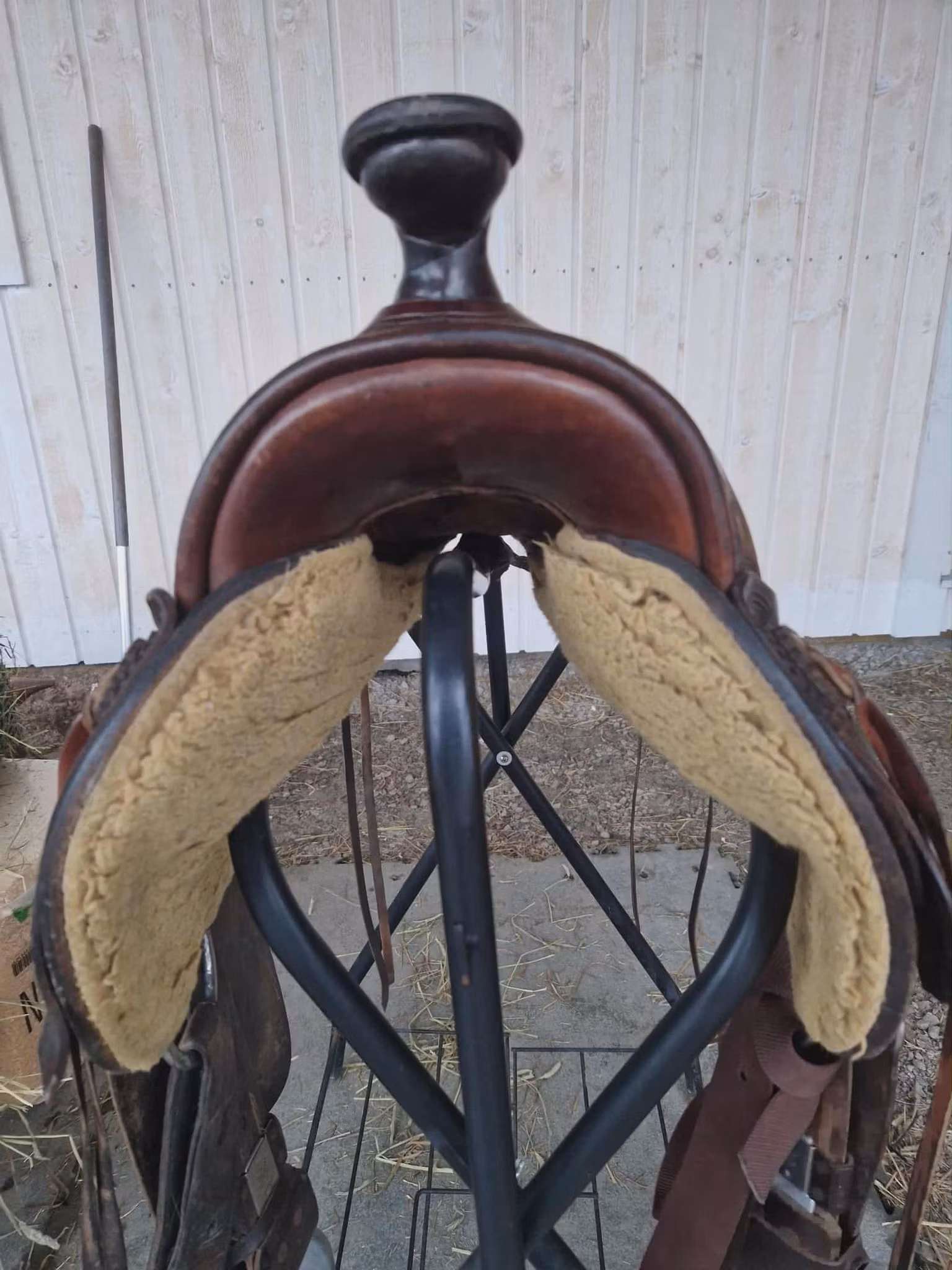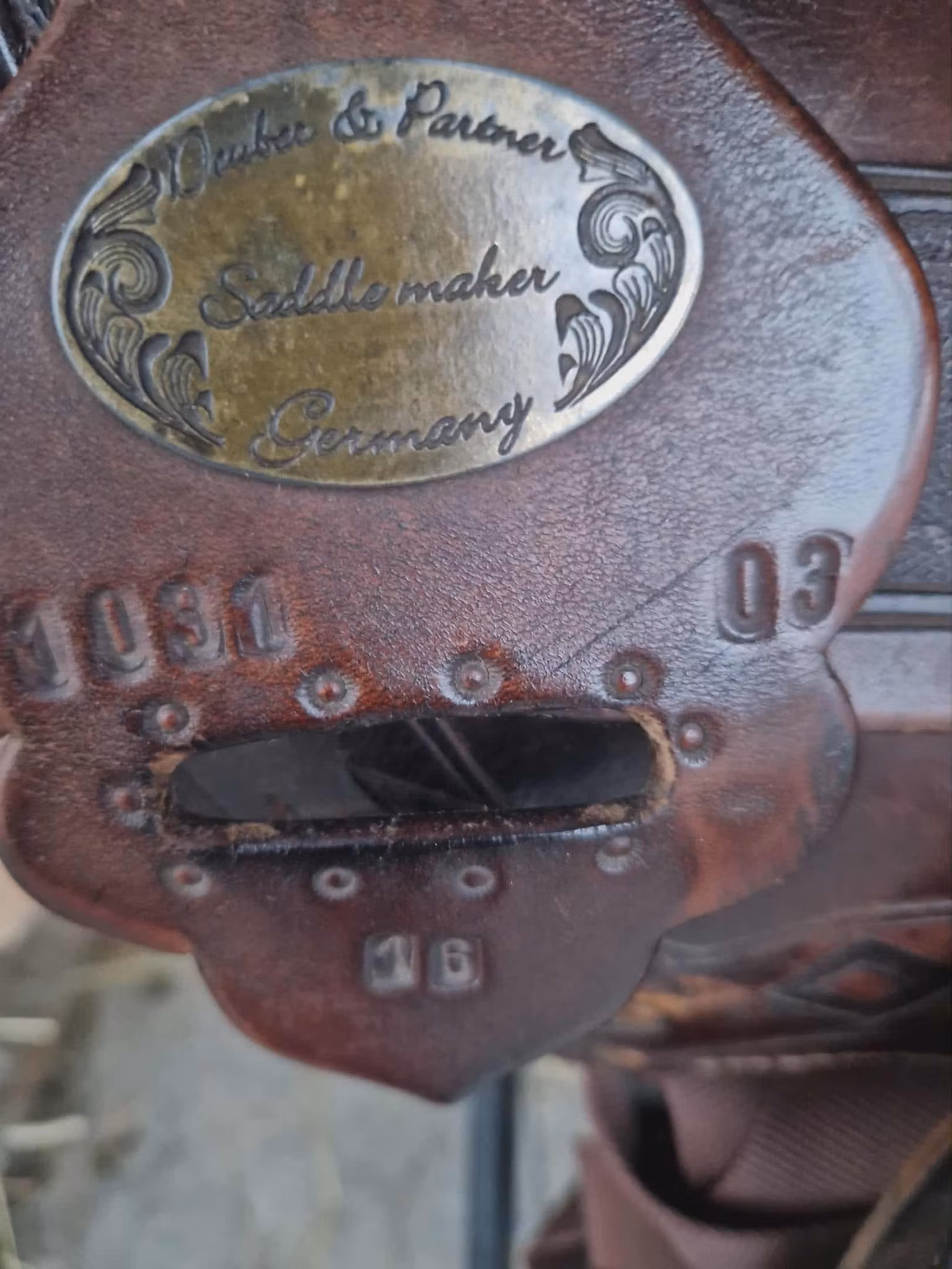 begagnad snygg deuber & partner 1031 Apache trailsadel med 03 (FQ) bom som ligger bra på bredda hästar som nordsvensk och andra kallblodshästar, den har medium sväng och det finns plats för manke. Sitsen är mjukpadda och 16 tum i storleken. Sadeln är kort och har en riktig råhudklädad träbom och väger 12 kg. Sadeln är knappt 60 cm lång.