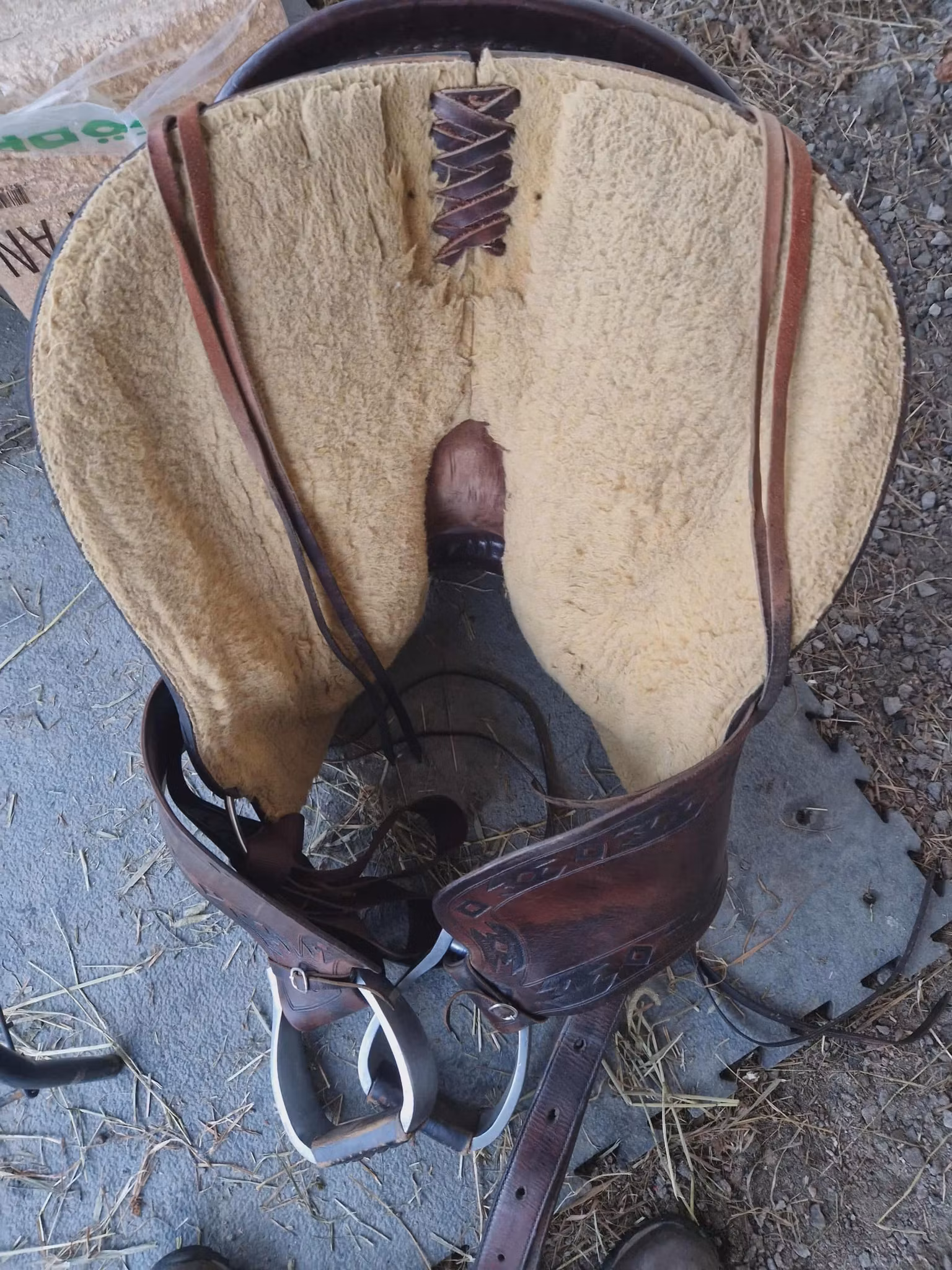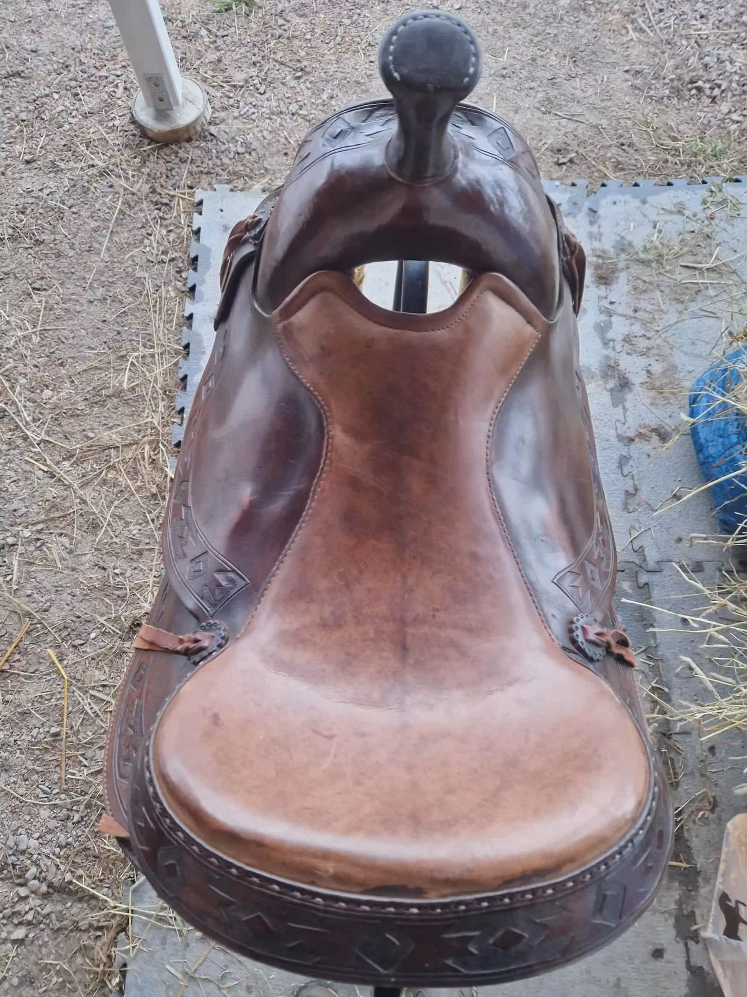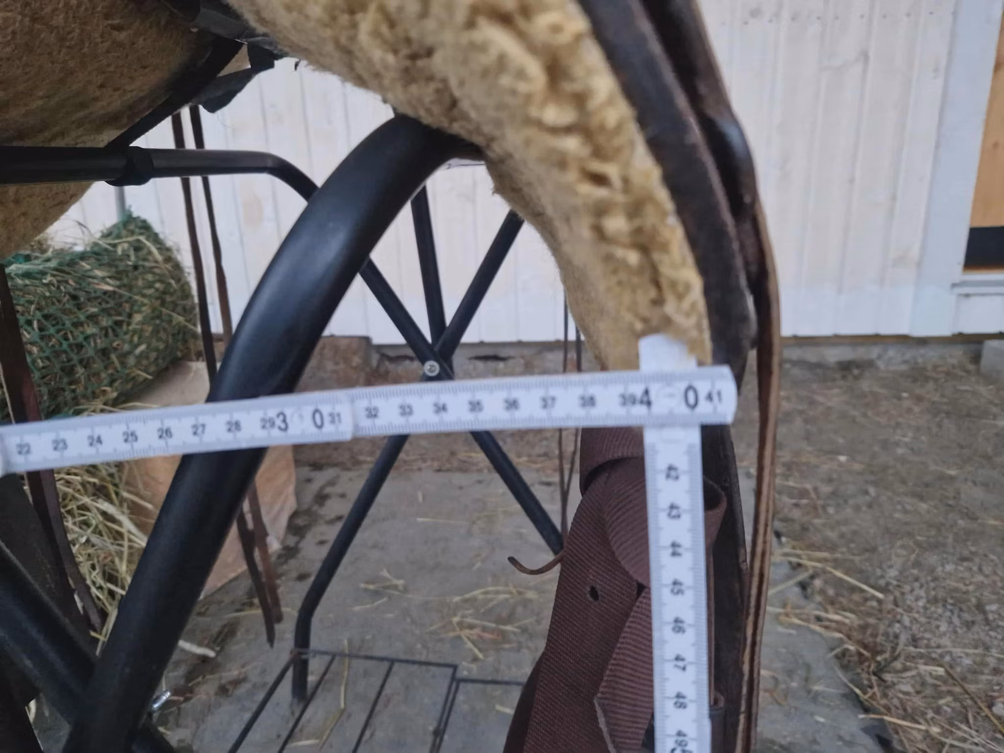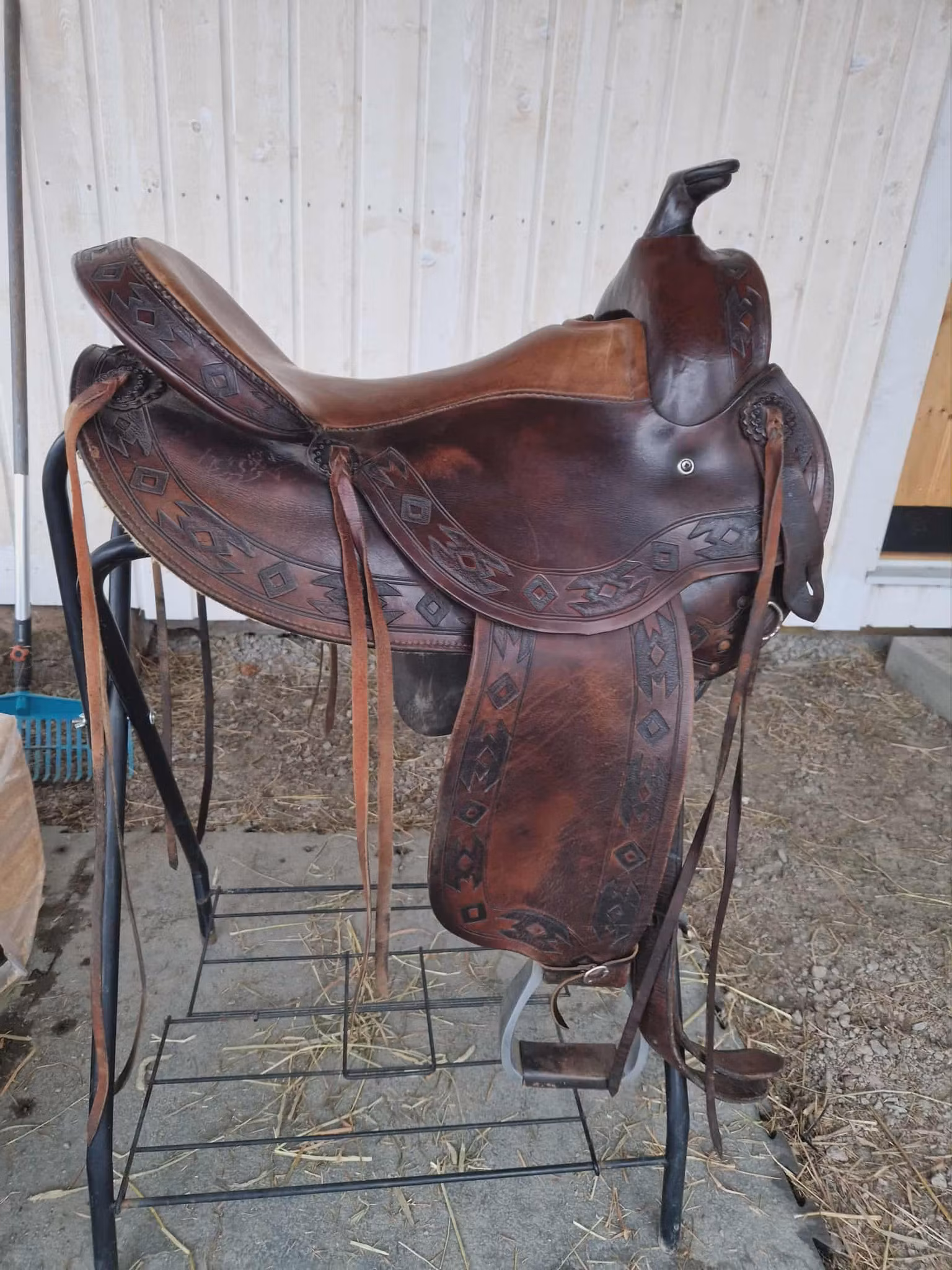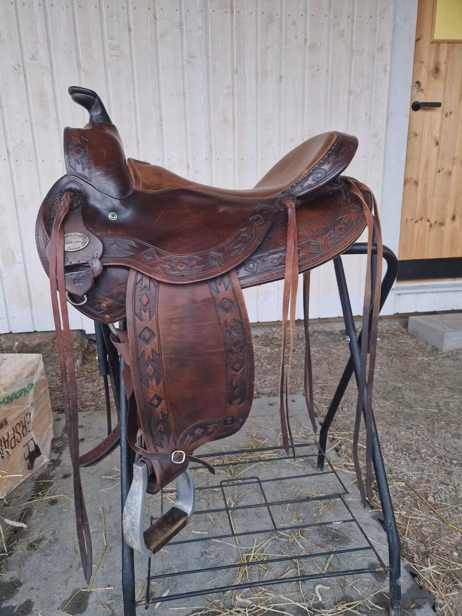 begagnad snygg deuber & partner 1031 Apache trailsadel med 03 (FQ) bom som ligger bra på bredda hästar som nordsvensk och andra kallblodshästar, den har medium sväng och det finns plats för manke. Sitsen är mjukpadda och 16 tum i storleken. Sadeln är kort och har en riktig råhudklädad träbom och väger 12 kg. Sadeln är knappt 60 cm lång.