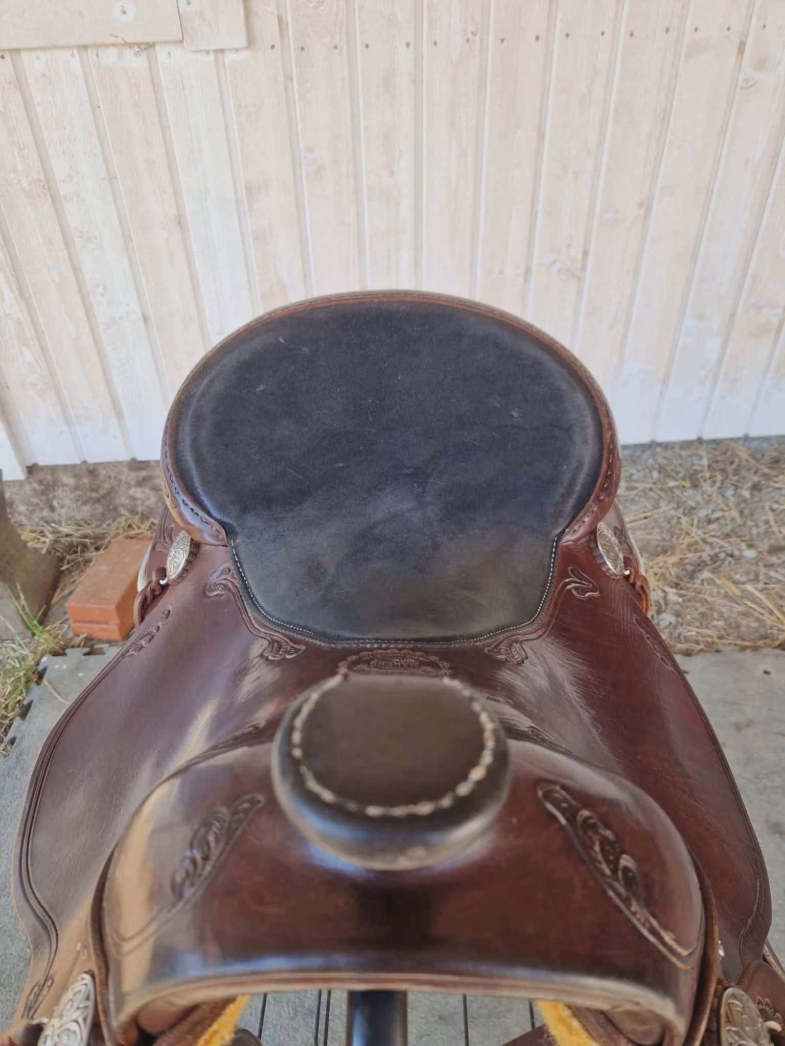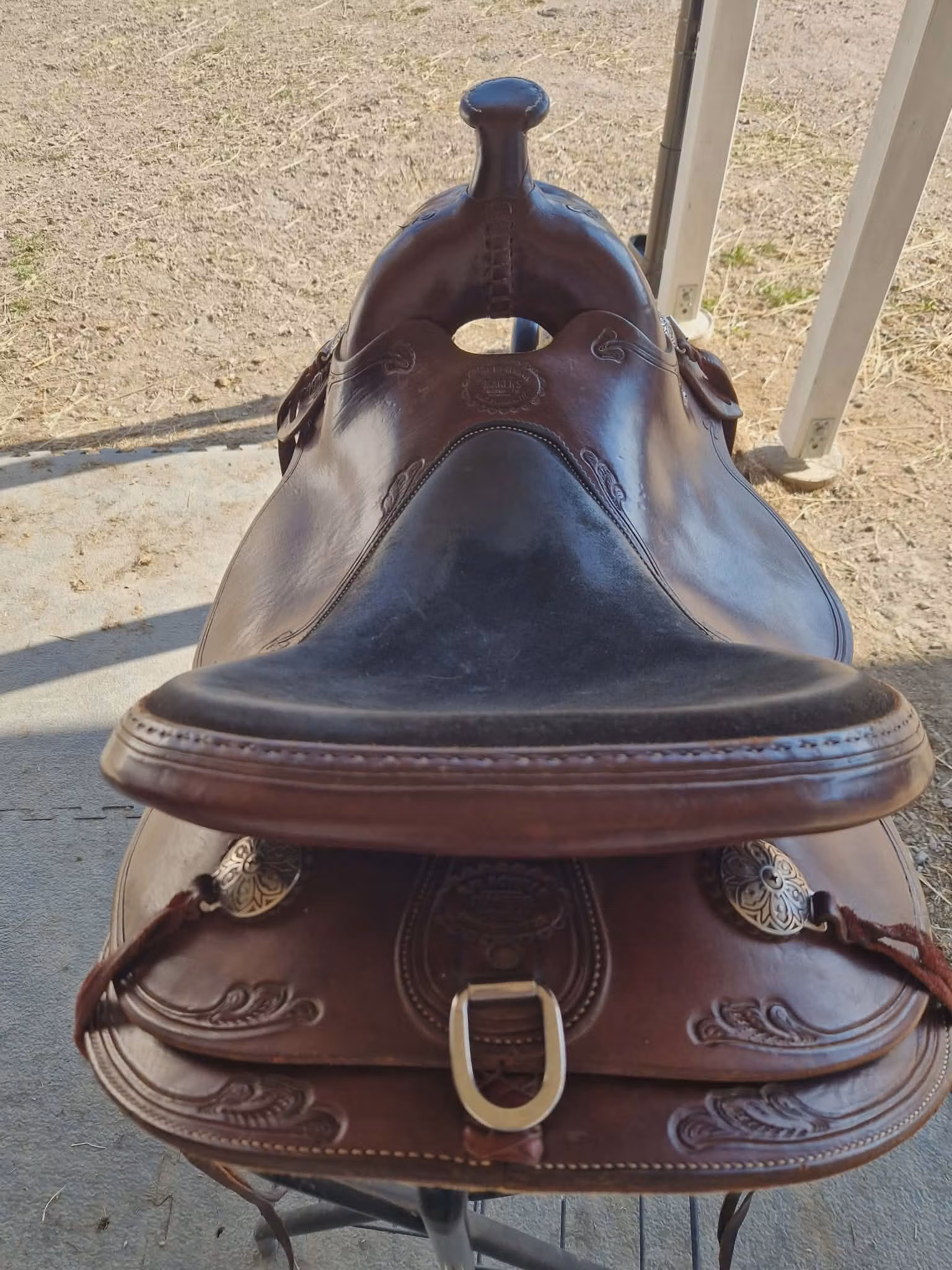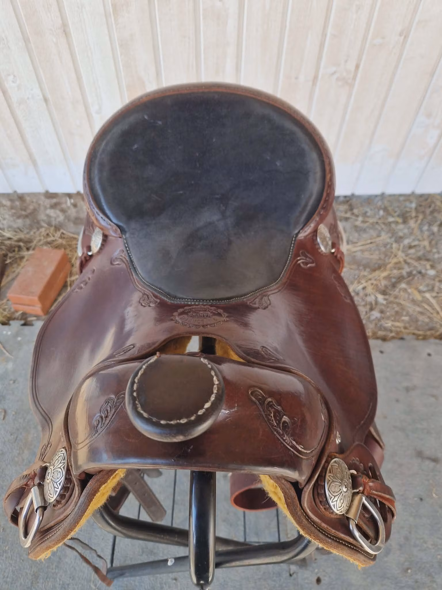 - Trim: Horseshoe Brand Cathedral Conchos with Tie Loops All Hardware including the saddle screws and washers is Stainless Steel. Saddle strings cut from premium 5-7 oz. burgundy latigo. The bicycle style, padded seat is constructed with 3/8" closed cell foam covered with 4-5 oz. chap leather. We use the Union Lockstitch to sew and pull the 277 white nylon thread tight at 5 ½ stitches to the inch.