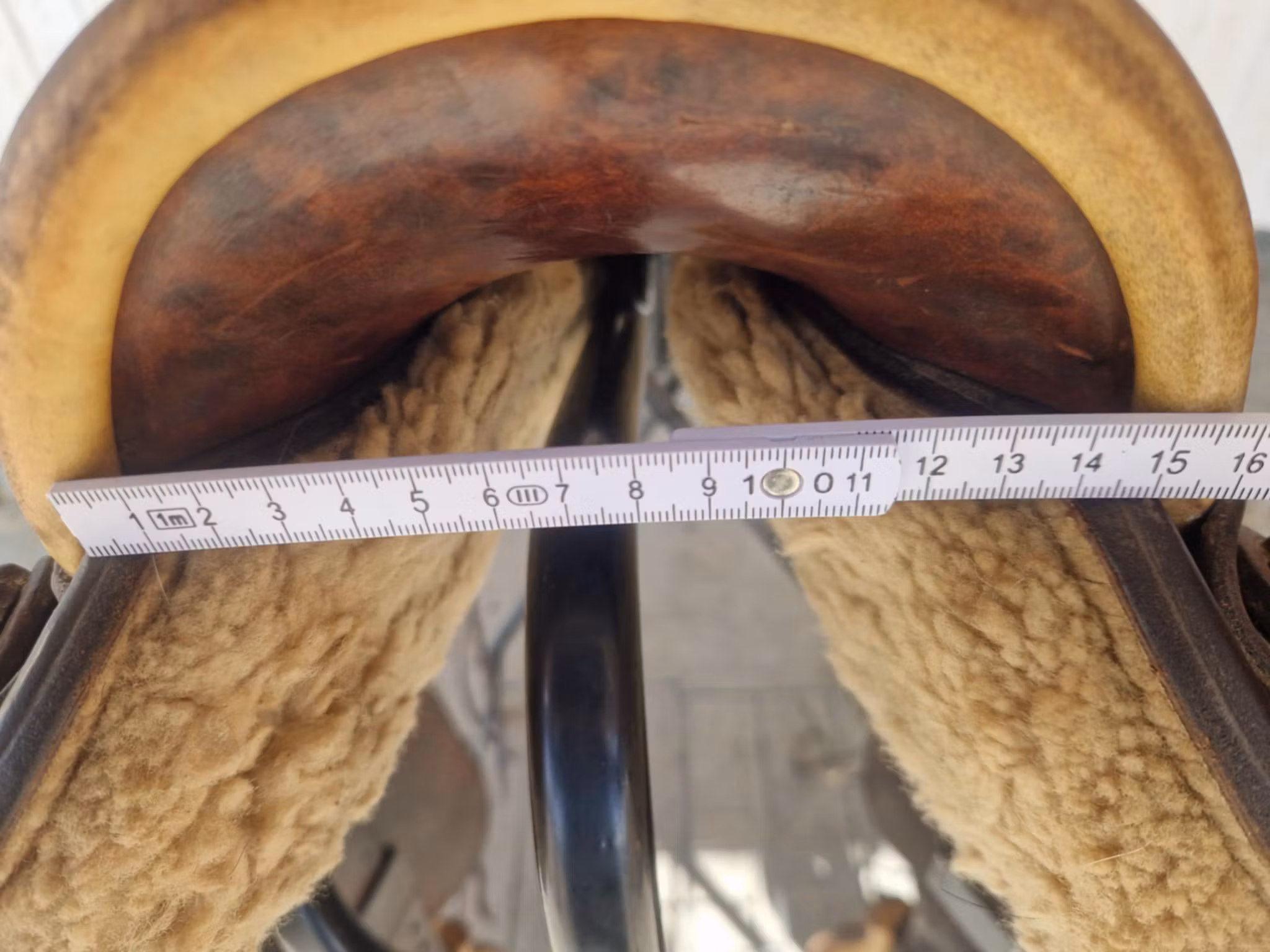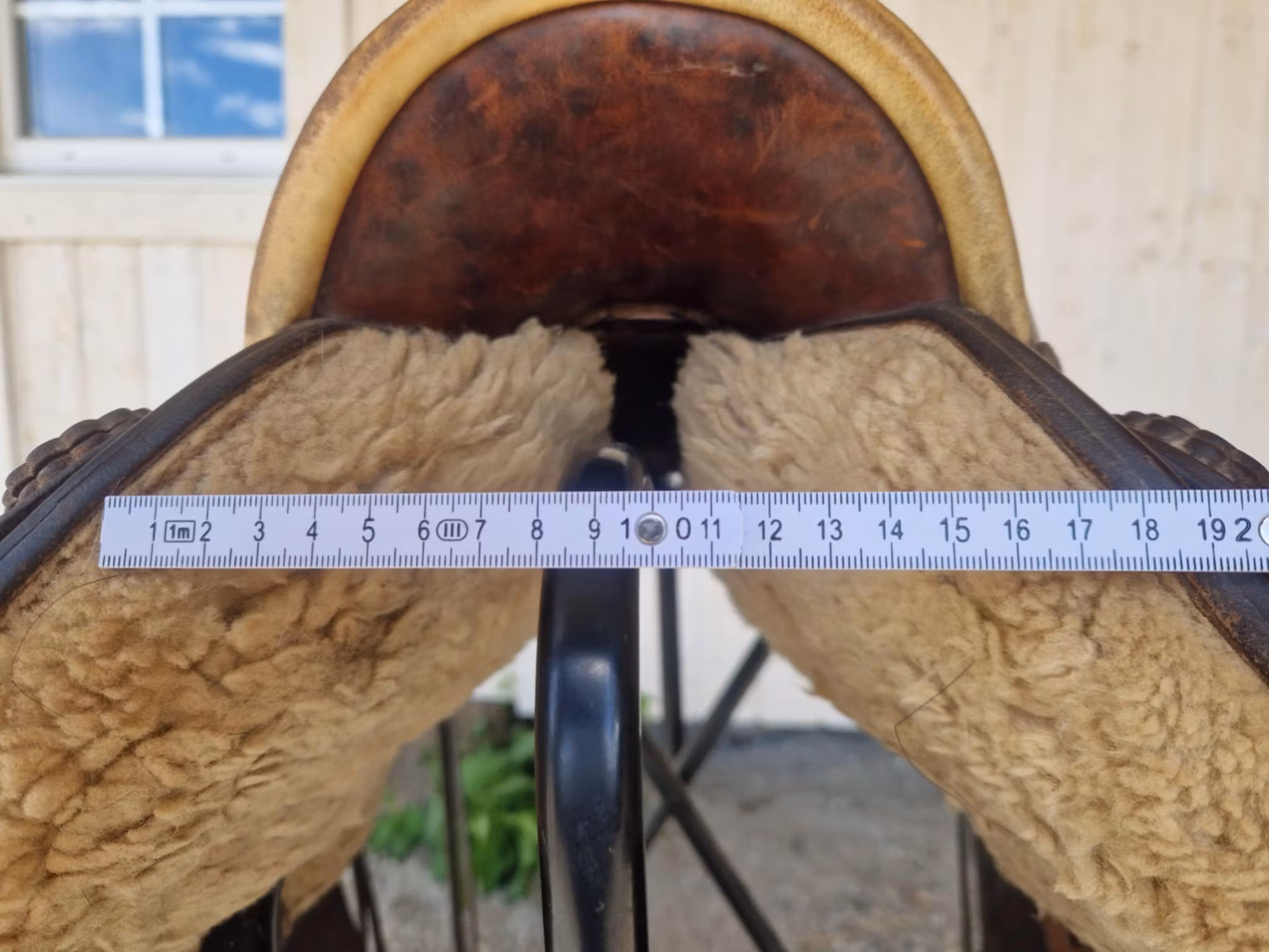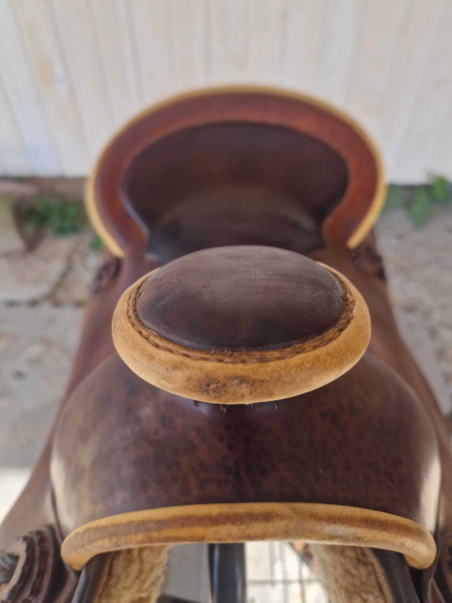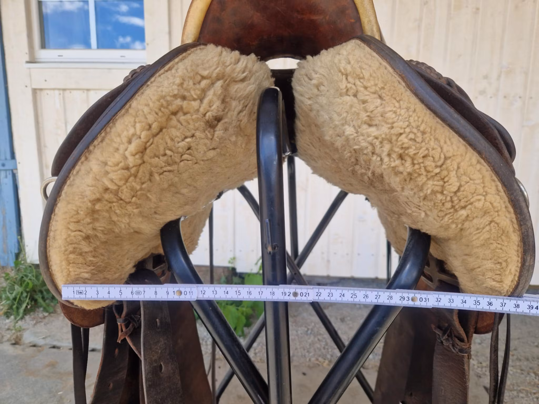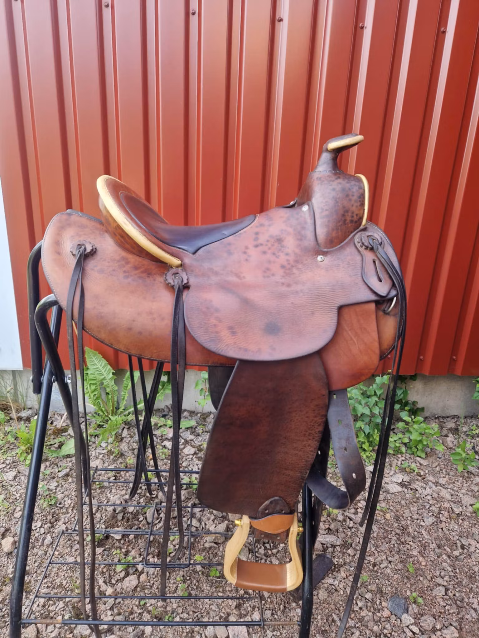Kvalitäts custom made westernsadel från RIESER SADDLERY Tyskland, en unik Oldtime /Allround sadel med SQ bom som passar på många hästar som är smala, max. medium bredd , lite takformad i fram (eller hög manke) med ganska rak rygg (som fullblod, travare eller arab o.s.v). Sadel har en dypp bekväm paddad inlaysits som är 15 tum i storlek.