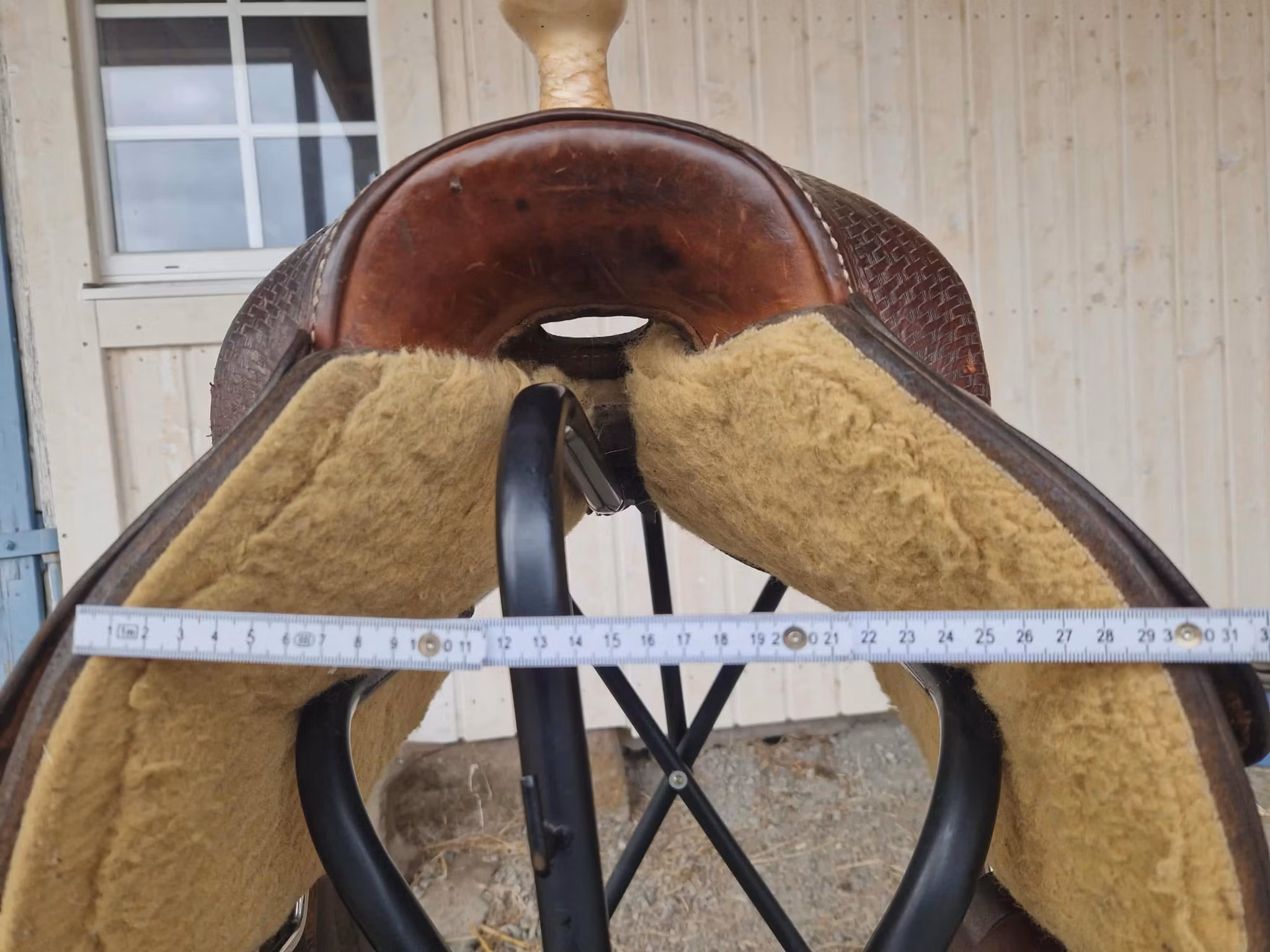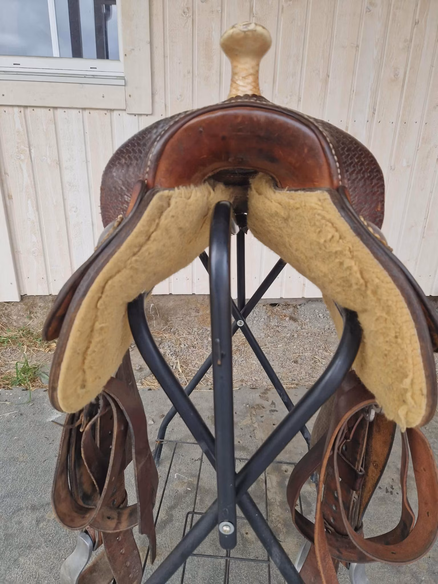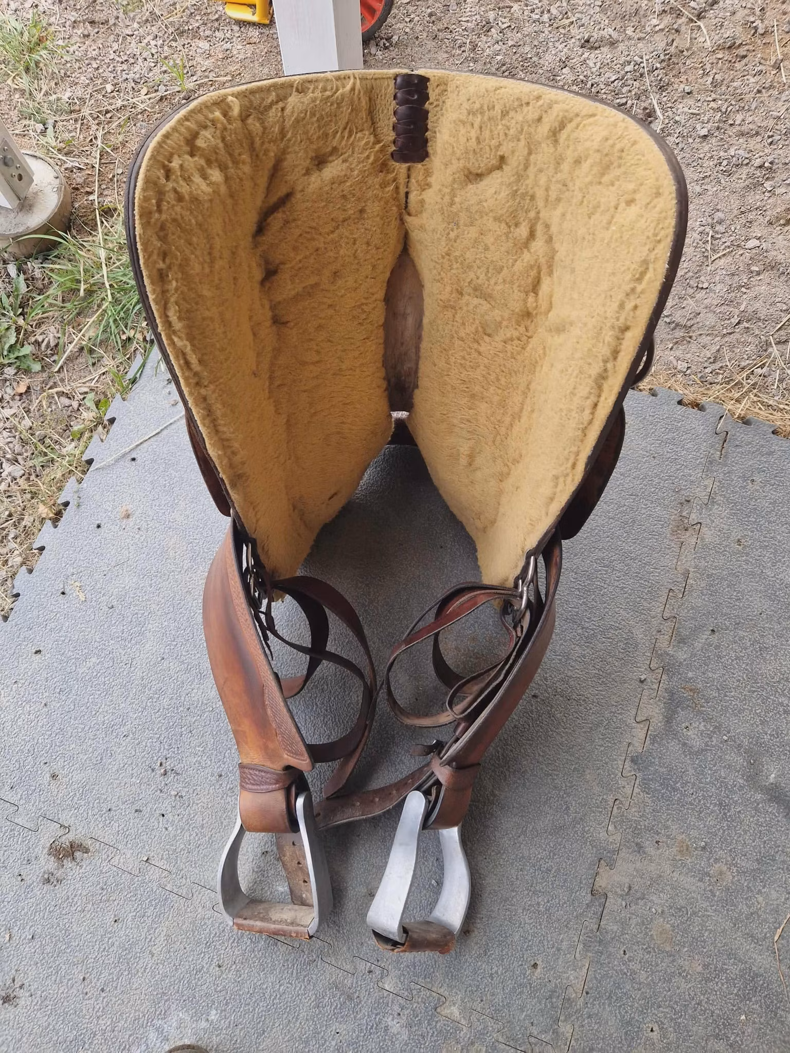 Sadeln är äldre och är mycket använt den har bruksspår, men inga som påverkar användningen och den är jättebekvämt att rida i.