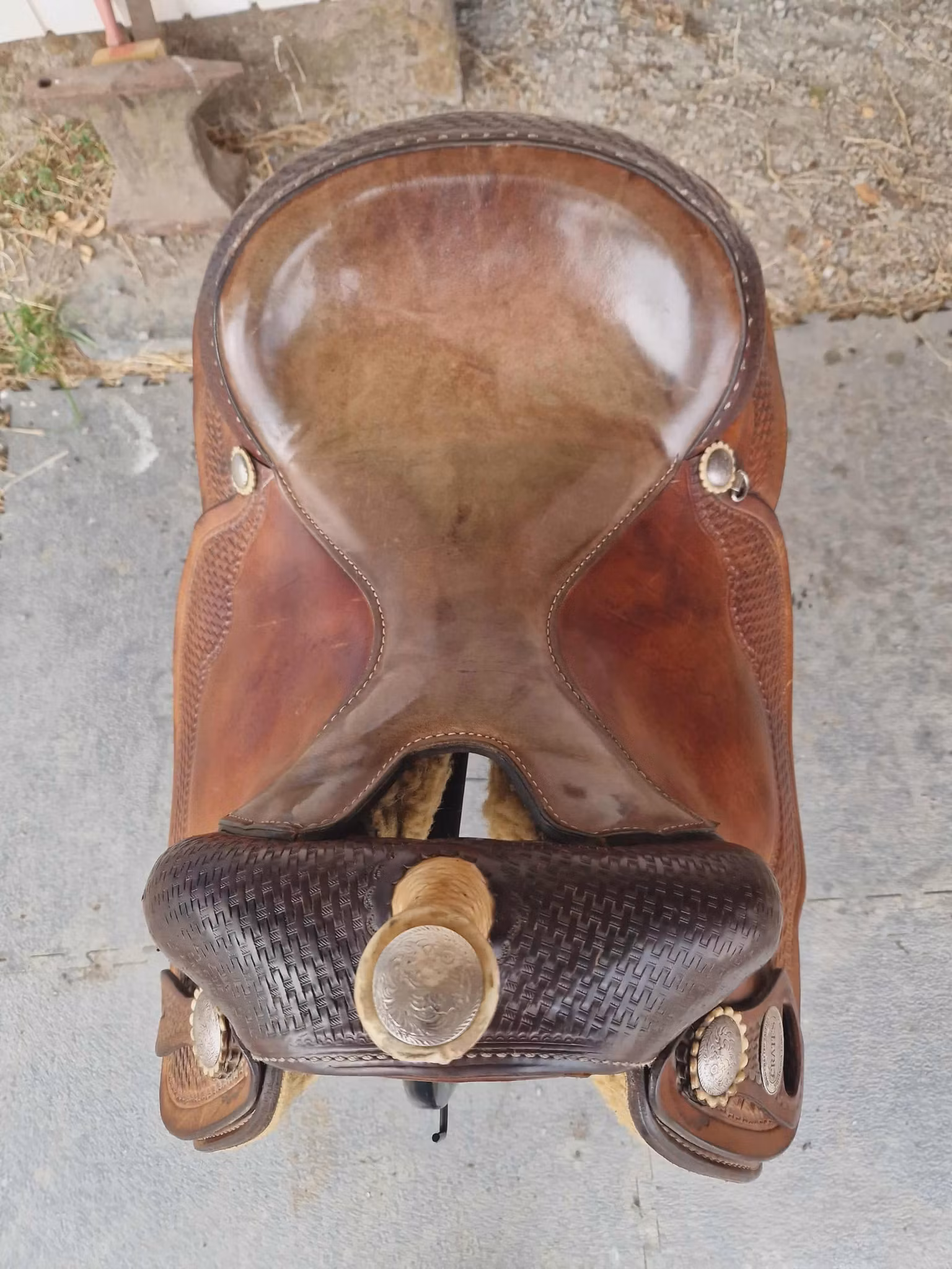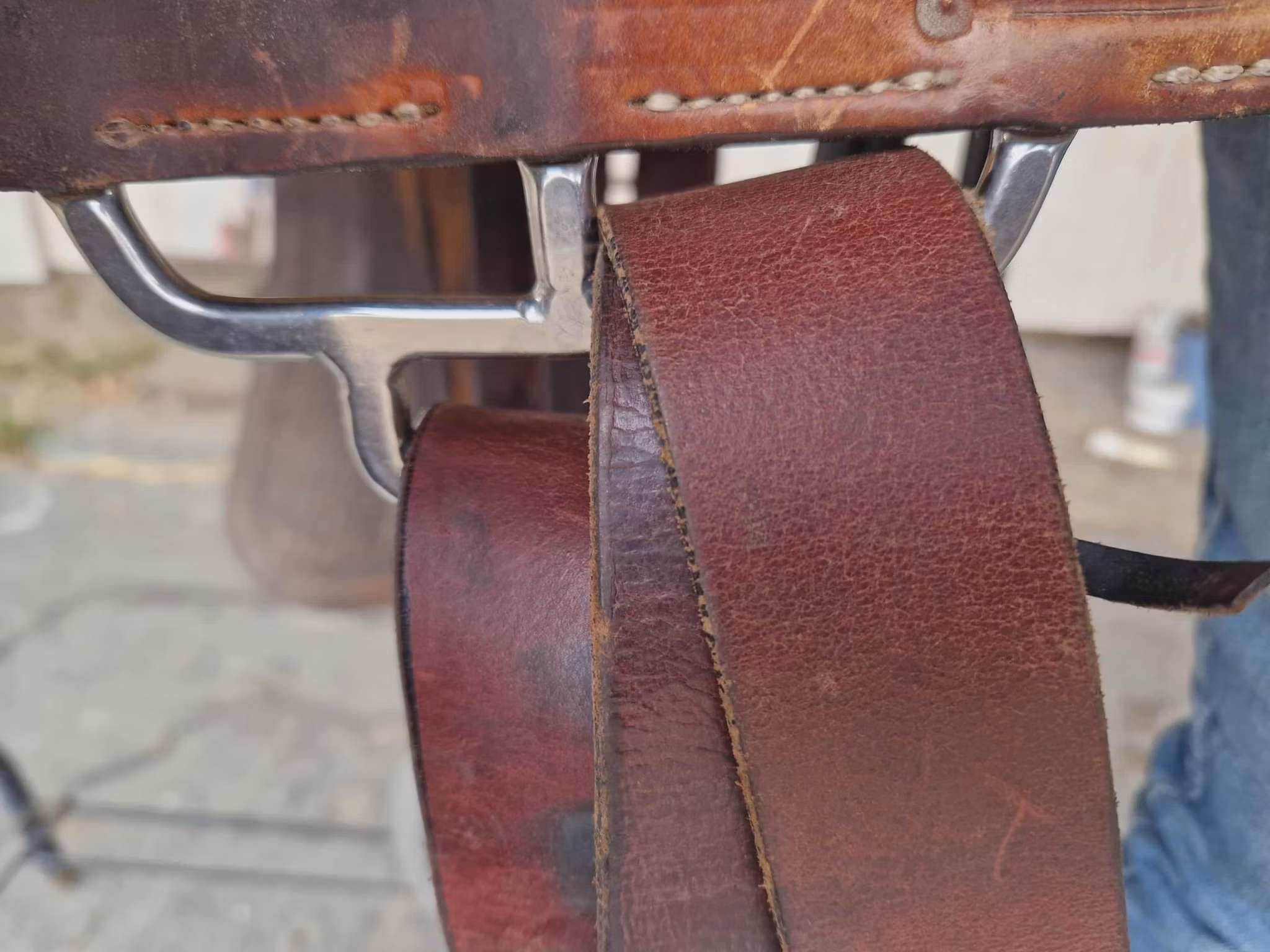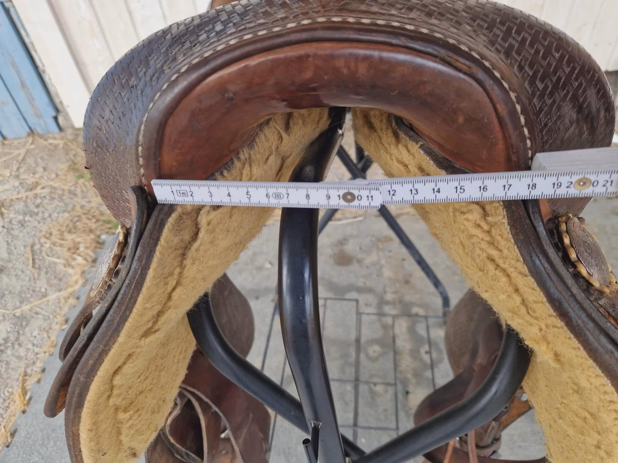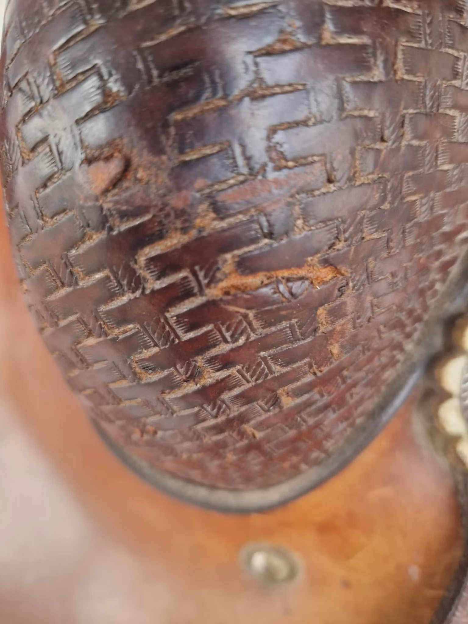 Sadeln är äldre och är mycket använt den har bruksspår, men inga som påverkar användningen och den är jättebekvämt att rida i.